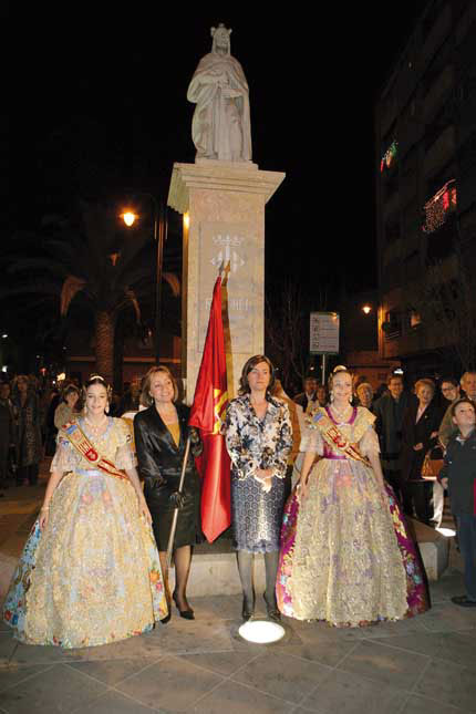 Los actos de esta jornada continuaron con la bajada de la bandera desde el balcon del Ayuntamiento, a la que siguió el Te Deum en la cercana parroquia de Santa Catalina. Despues, la comitiva se trasladó hasta el monumento de Jaime I situado en la plaza de San Judas Tadeo, donde se efectuó la ofrenda de una corona de laurel, depositada por la alcaldesa, Elena Bastidas Bono, y las falleras mayores de la ciudad, la niña Maria Sifre Casterá y la señorita Sonia Plaza Carrascosa.