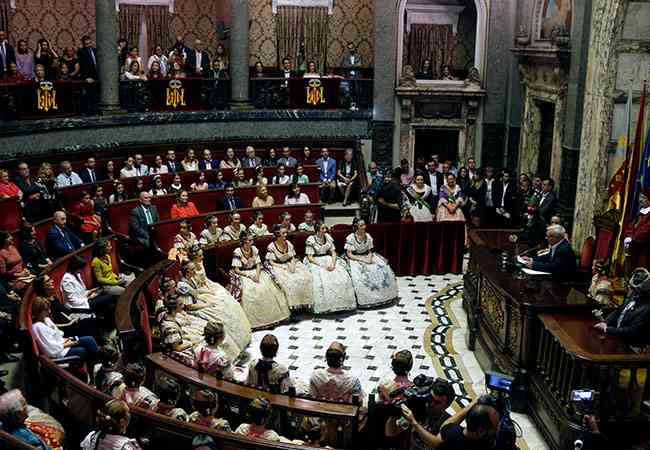 “Hoy este Hemiciclo, donde la palabra cobra su máxima expresión como instrumento de diálogo y convivencia, acoge el acto de nombramiento de las Falleras Mayores de Valencia de 2018, Rocío Gil Uncio y Daniela Gómez de los Ángeles, máximas representantes de nuestra fiesta”, dijo Ribó.