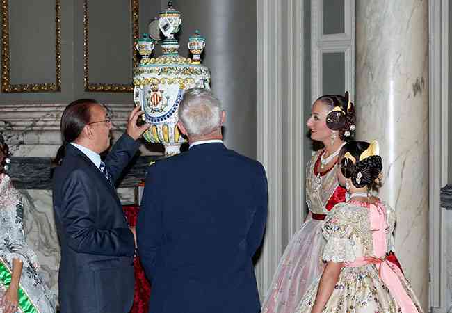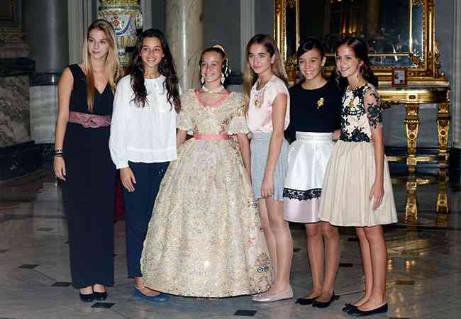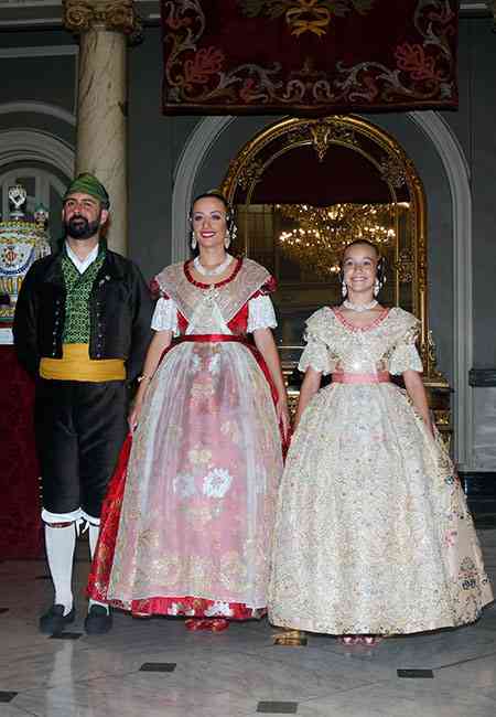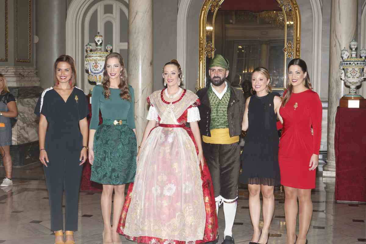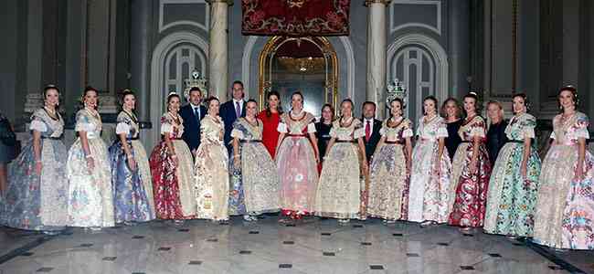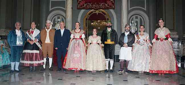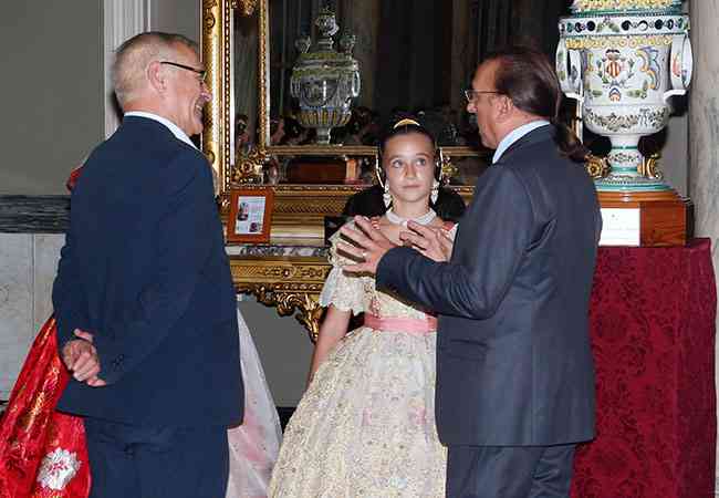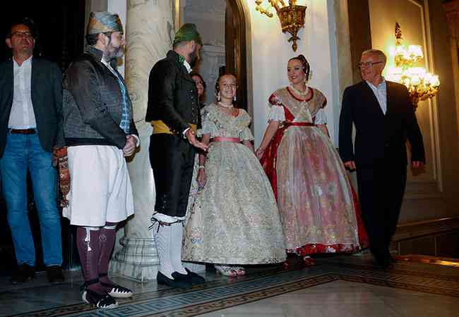 Los sones de ‘El Fallero’ anunciaban la llegada de las Cortes de Honor y de las Falleras Mayores de Valencia, Rocío Gil y Daniela Gómez, que fueron recibidas por el alcalde, Joan Ribó. A su lado se situaba Ramón Estellés, secretario general de la Junta Central Fallera.