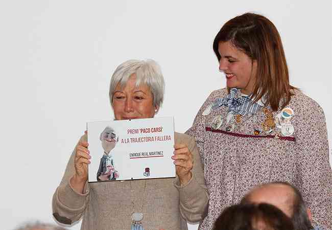 La primera edición del Premio ‘Paco Carsí’ ha sido concedido a Enrique Real Martínez, primer Presidente de Junta Central Fallera de la democracia. Un galardón que sería recogido, por Concha Carsí, hermana del que fuera concejal socialista en el consistorio valenciano. Socialista y fallero, fallero y socialista, como recordaría su hermana visiblemente emocionada ante la imagen que figura en el galardón del ninot de su hermano y que realizara su hijo, el artista fallero Carlos Carsí.
