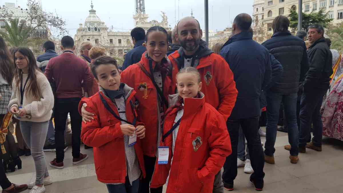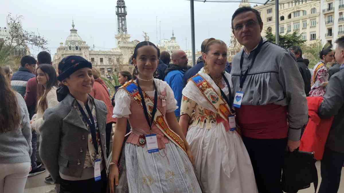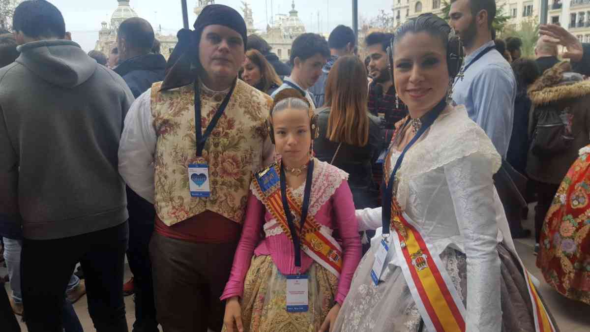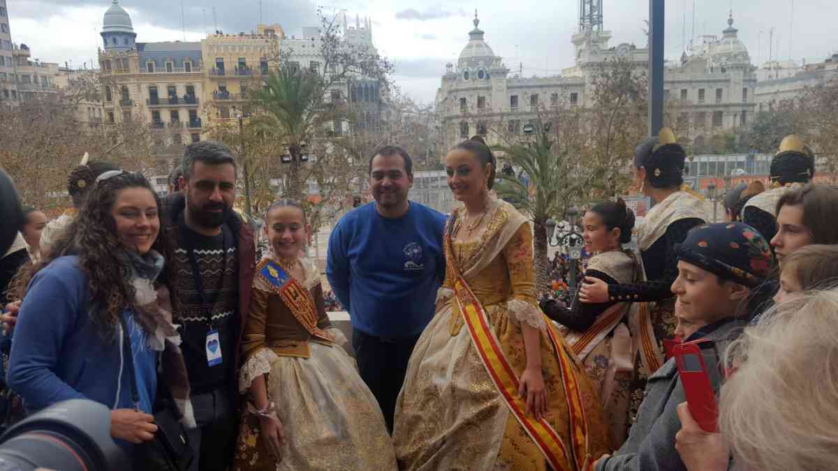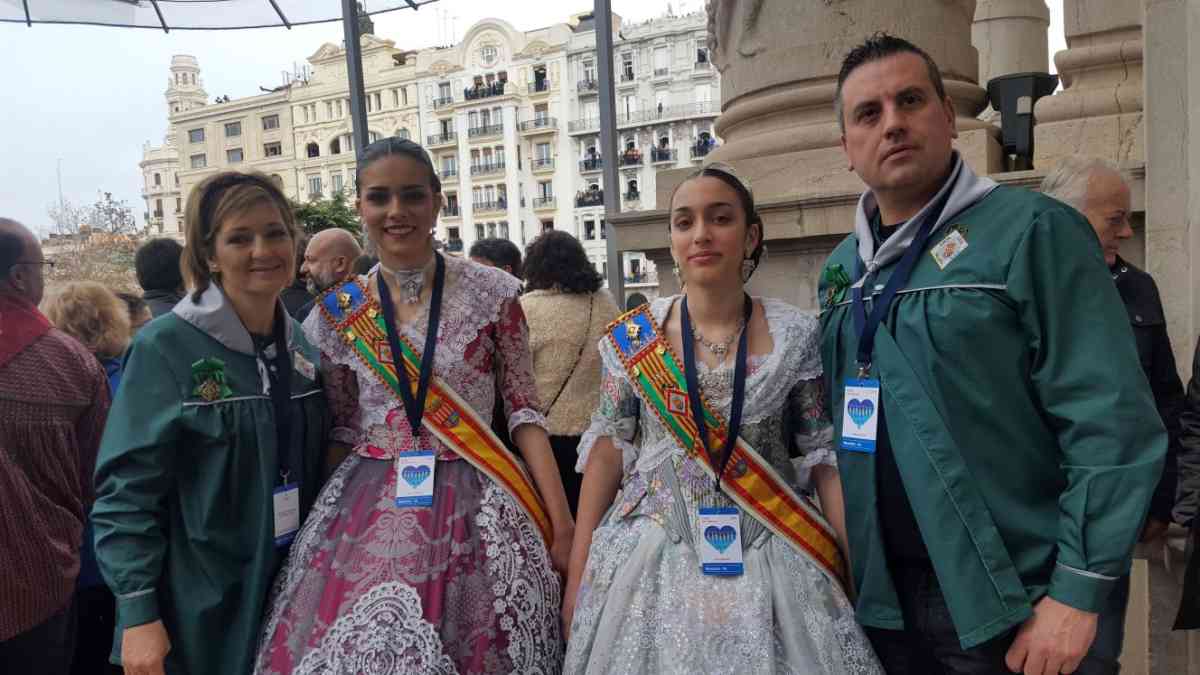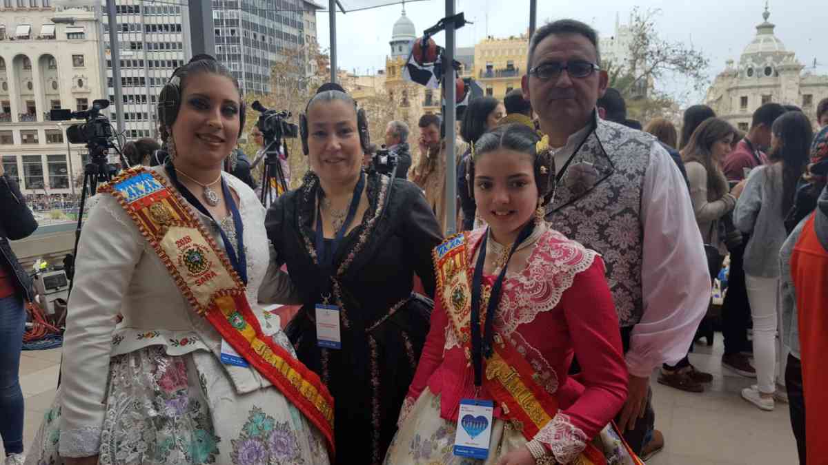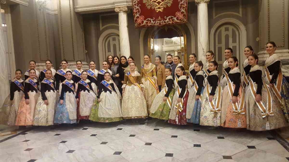 La lluvia dio una tregua y solo aparecía una vez terminado el disparo. Lluvia tenue, pero lluvia que obligaba a pasar al Salón de Cristal para poder posar junta a comisiones invitadas y Falleras Mayores de Valencia de otros años que hoy se acercaban hasta el balcón después de ver y oír la mascletà en alguna otra dependencia del consistorio.