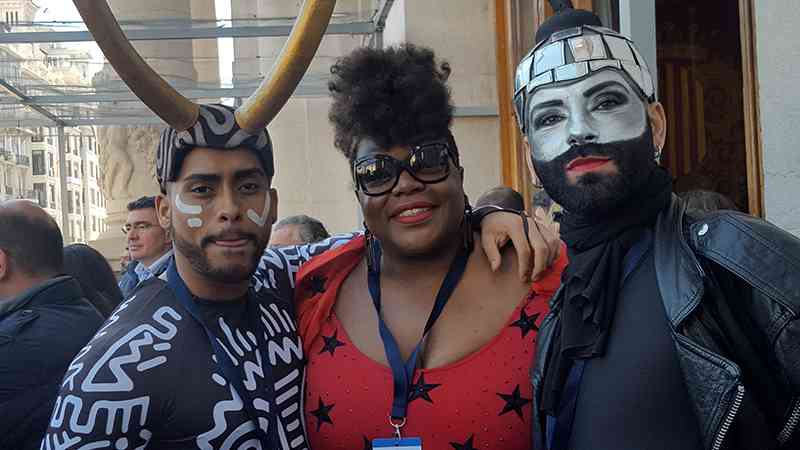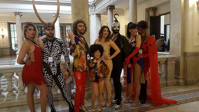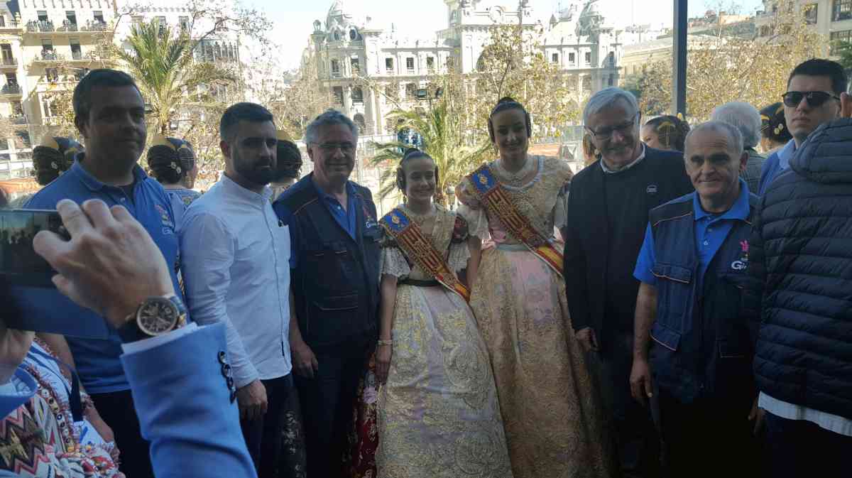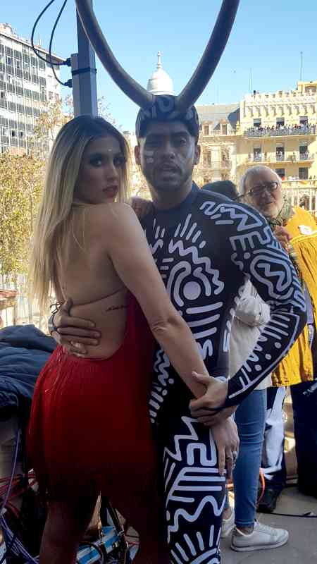 Los actores de The Hole Zero, que desde el 16 de febrero están en el teatro Olympia de nuestra ciudad, animaron el balcón al asistir a la mascletá del día 7 de marzo ataviados con el vestuario habitual del espectáculo. Por fin salió un día perfecto de sol y calor, lo cual se notó en la plaza, que presentaba un aforo completo.