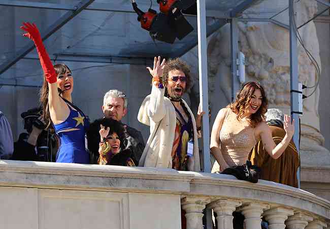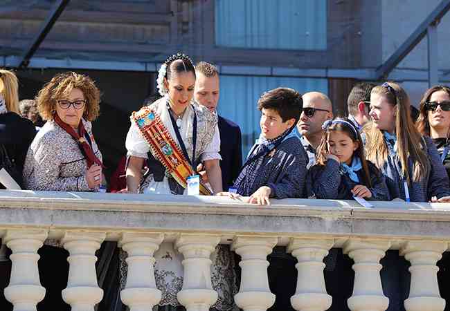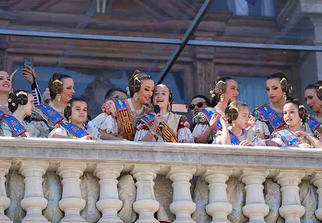 Pasacalle previo de las Falleras Mayores y sus cortes alrededor de la plaza, para posteriormente subirse a un animado balcón gracias al cuadro artístico de la nueva producción de la saga The Hole, en el Teatro Olympia hasta el 25 de marzo, con su director artístico, Iñaki Fernández, al frente.