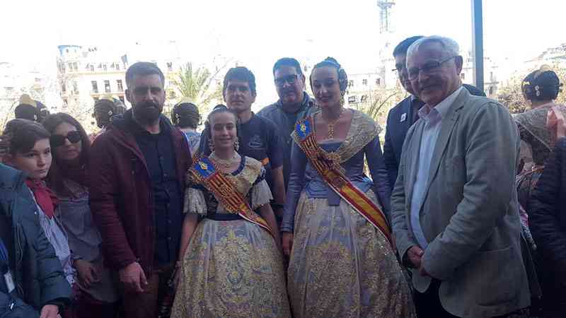 En el público se pudo ver a muchas comisiones que llegaban del acto celebrado en la Diputación de Valencia y que congregaba a las juntas locales y las comisiones falleras. En el balcón hubo muchas de ellas, caso de la Junta Local de Benaguasil. También los alcaldes de las localidades de la provincia se dieron cita en un concurrido balcón donde pudimos ver al cantante valenciano Emilio Solo, acompañado por su hijo. También hay que destacar la presencia en la plaza del grupo musical Bombai.