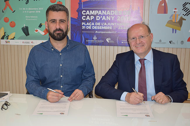 El concejal de Cultura Festiva, Pere Fuset, y el director regional de El Corte Inglés, Juan Sabater, han renovado el patrocinio de la compañía de grandes almacenes a Junta Central Fallera para el ejercicio 2019 en un acto que ha tenido lugar esta mañana en el Ayuntamiento de Valencia.
