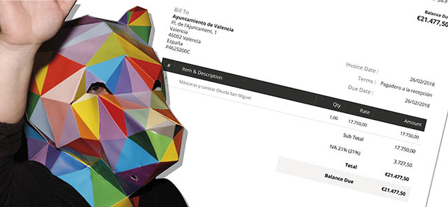 En 2018 las diez comisiones participantes optaban a un montante de 22.600 euros disgregados en 25 premios. Por el contrario, la concejalía de Cultura Festiva se gastaba casi la misma cantidad, 21.477,50 euros, en 200 máscaras que portaría otros tantos falleros, para finalizar la cabalgata al ritmo de una canción en inglés. Unas máscaras suministradas por la empresa PF Urban Agency, SL propietaria al parecer de los derechos de explotación del artista Okuda San Miguel, y cuyo coste, sólo de una máscara, tal y como oferta en su página web, asciende a 80,00 € la unidad. Un gasto que sería ampliado por un número indeterminado de caretas, y decimos indeterminado porque en la propia factura emitida al Ayuntamiento sólo aparece como cantidad un ‘1’, como descripción del artículo, ‘Máscaras y caretas Okuda San Miguel’ y el importe: 17.750,00 € más 3.727,50 de IVA.