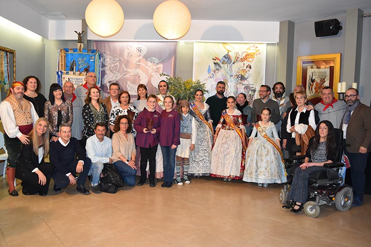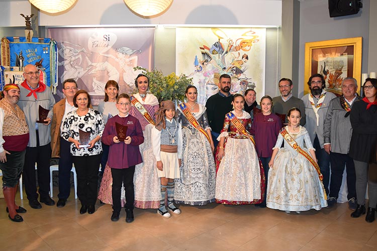 El casal de la falla Maestro Gozalbo-Conde de Altea acogió ayer lunes, 4 de marzo, la entrega de los Premios Héroes Fallers en su VI edición. Las Falleras Mayores de Valencia, Marina Civera y Sara Larrazábal, acompañaron a los máximos representantes de la comisión, Macarena Soriano, Amparo Romero, Álvaro Vañó y Miguel Prim, en la entrega de galardones.