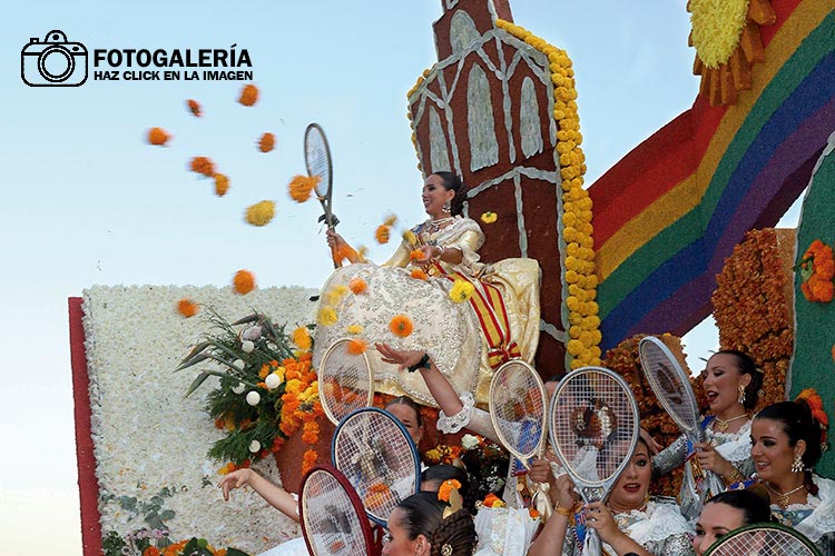 Al igual que en años anteriores, el recorrido incluyó una vuelta de exhibición y otra para recoger los premios de las carrozas, divididas en las categorías Especial A, Especial B, Ordinaria A y Ordinaria B. El máximo galardón, el Premio Extraordinario Barón de Cortes, fue para la carroza realizada por Marina Puche y las hermanas Guaita, Galopant en la Batalla. Y con el trueno de aviso, comenzó el lanzamiento de flores.
