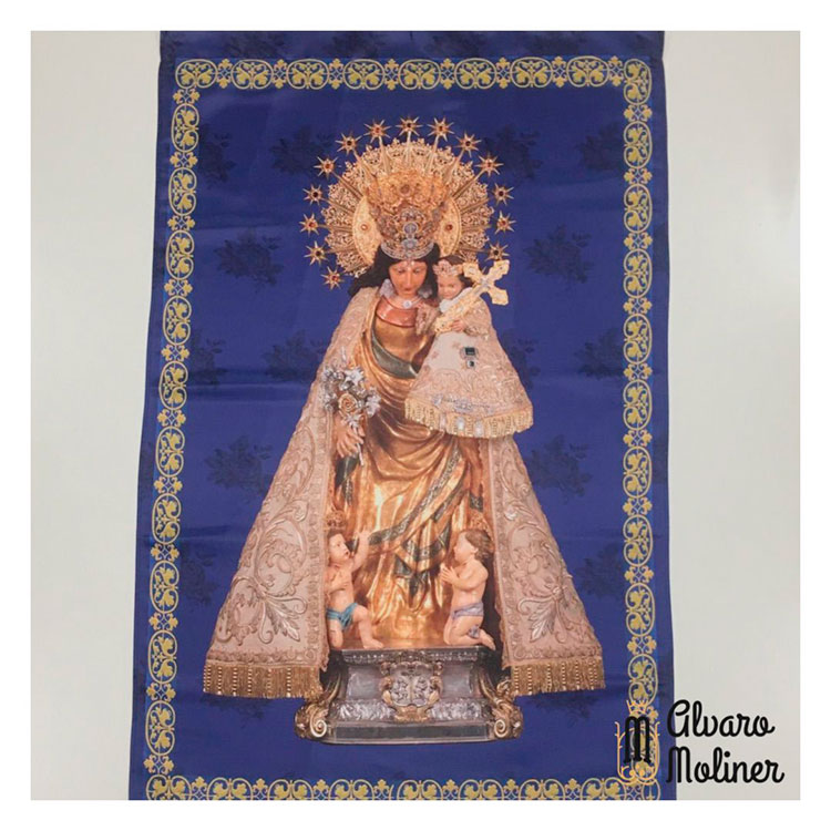 La balconera de la Mare de Deu está disponible en tres colores, rojo granate, azul marino y blanco, y con dos opciones de remate: remate simple con costura o remate con pasamanería dorada en laterales y flecos oro. Esta obra exclusiva de Álvaro Moliner, hecha en la Comunitat Valenciana, está hecha en raso poliéster lavable, con vetas en las esquinas superiores para facilitar la sujeción al balcón, y tiene unas medidas de 120 x 80 cm.