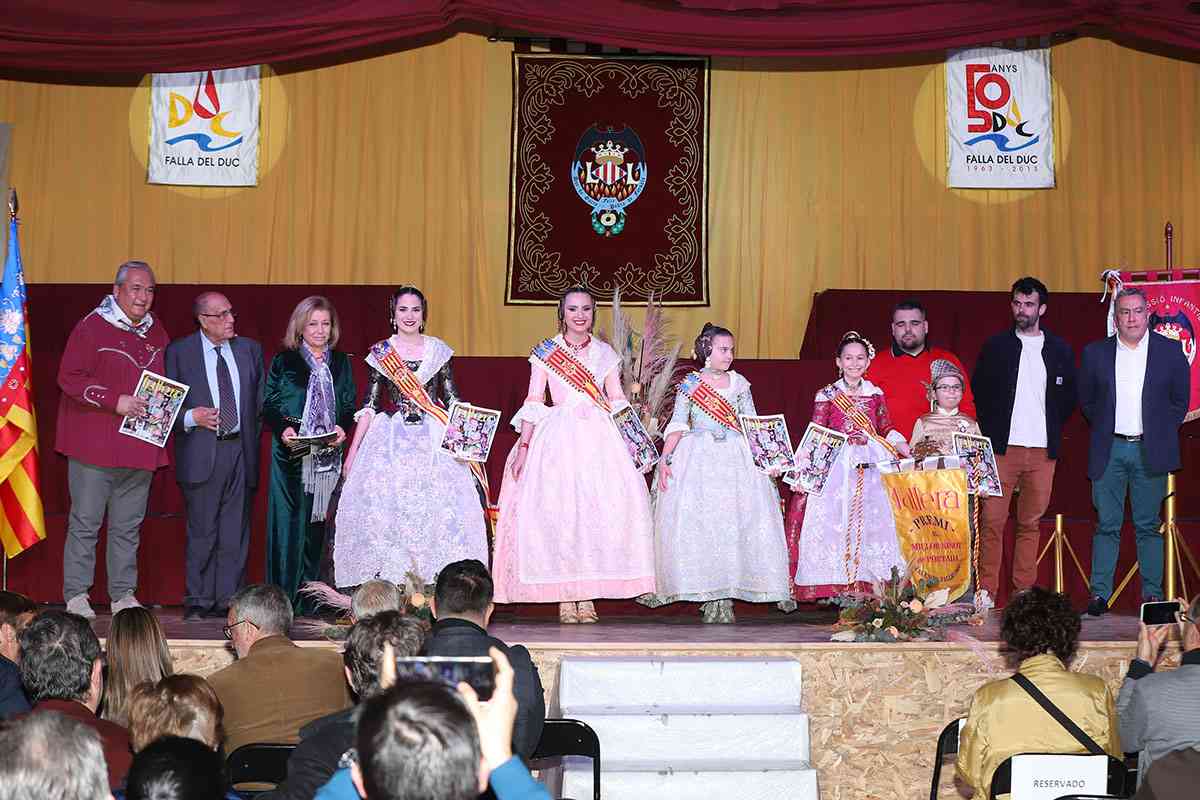 Las Falleras Mayores de Valencia, María Estela Arlandis y Marina García, junto al fundador de Actualidad Fallera, Braulio Torralba, y el gerente de Grupo MPG, Jorge Torralba, entregaron el palet distintito del premio a los máximos representantes del Duc, Sara Marín, Miriam Lozoya, Joan García y Marcos Soriano, el artista fallero, Mario Pérez, y el diseñador Paco Camallonga. Asimismo, se contó con la presencia de la presidenta de la Asociación de Familiares de Enfermos de Alzheimer, Ana María Ruíz.