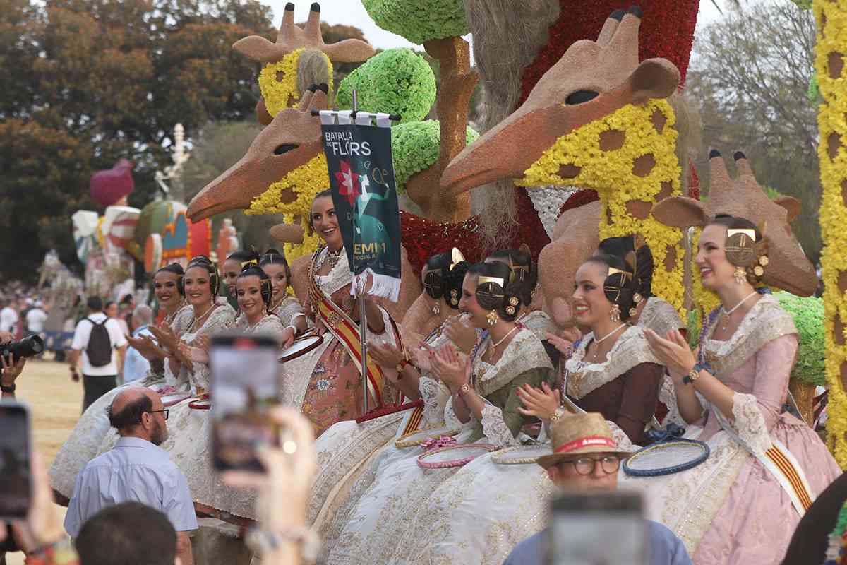 La Batalla de Flores volvió a llenar de color y diversión la Alameda de Valencia. El centenario festejo tuvo la novedad de la recuperación, a modo de decorado, del pabellón municipal de Carlos Cortina, cuya recreación adornó el palco de autoridades. Y en cuanto a galardones, el premio extraordinario Barón de Cortes y el primer premio de la sección Especial A fueron para 'Áfrika', carroza firmada por Vicente Julián García Pastor y tripulada por la Fallera Mayor de Valencia 2024 y su Corte de Honor.
