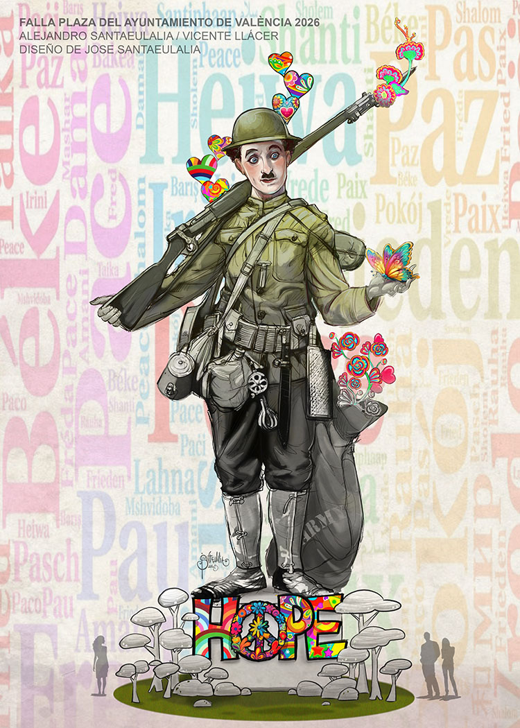 En cuanto a la falla grande, por segundo año consecutivo será el tándem formado por Alejandro Santaeulalia y Vicente Llácer el que plante en la plaza del Ayuntamiento, nuevamente con un diseño de Josete Santaeulalia. En esta ocasión, la falla grande se llama 'Hope', un canto a la esperanza y la resiliencia. Con 'Hope' el mensaje toma forma, dejando claro que las guerras nunca son un buen camino. En la figura central se puede ver la icónica y universal imagen de Charles Chaplin en su película ‘¡Armas al hombro!’, un largometraje satírico sobre el belicismo que ahora se convierte en falla para denunciar también todo lo que se está viviendo en el mundo. 'Hope' nos habla de cómo se puede cambiar el mundo y transformar la oscuridad en alegría, color y paz. Un planteamiento estético moderno, con 27 metros de altura.