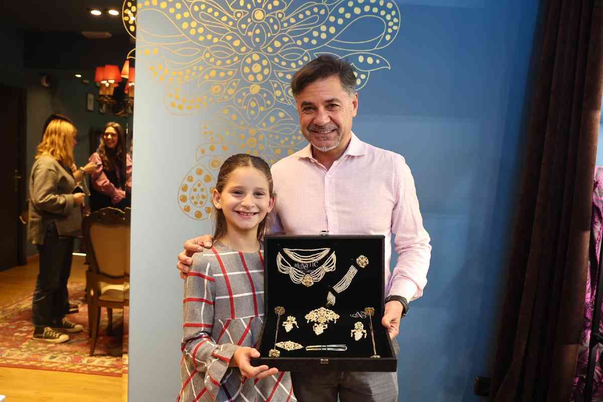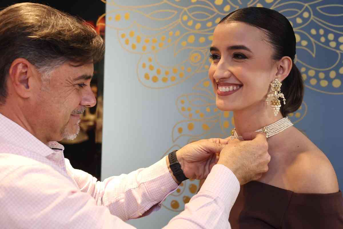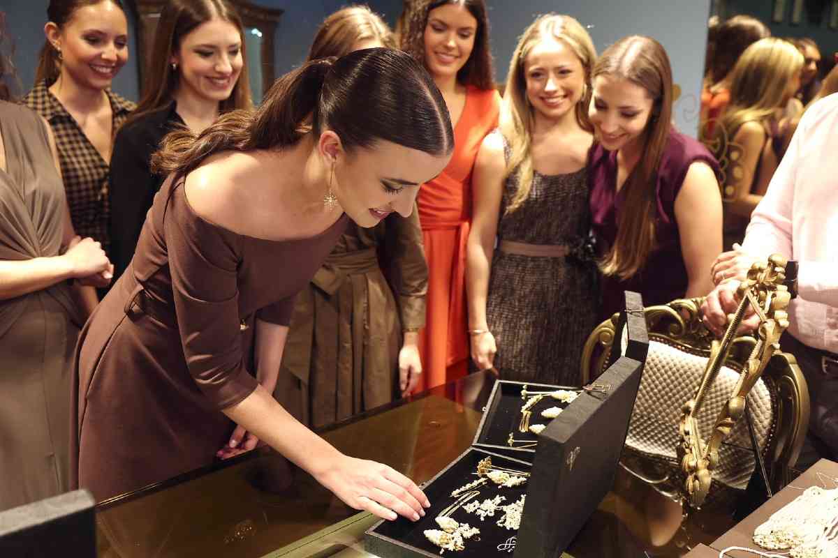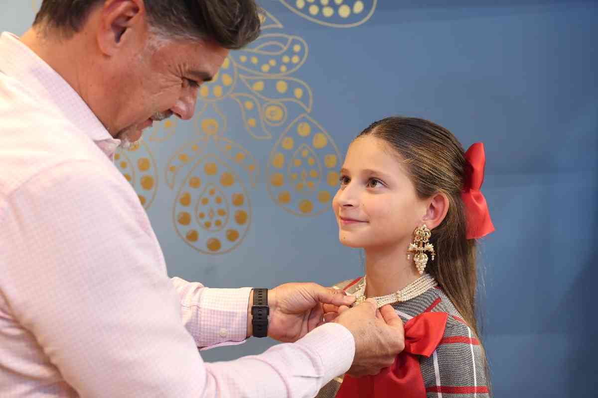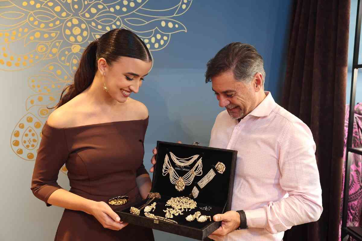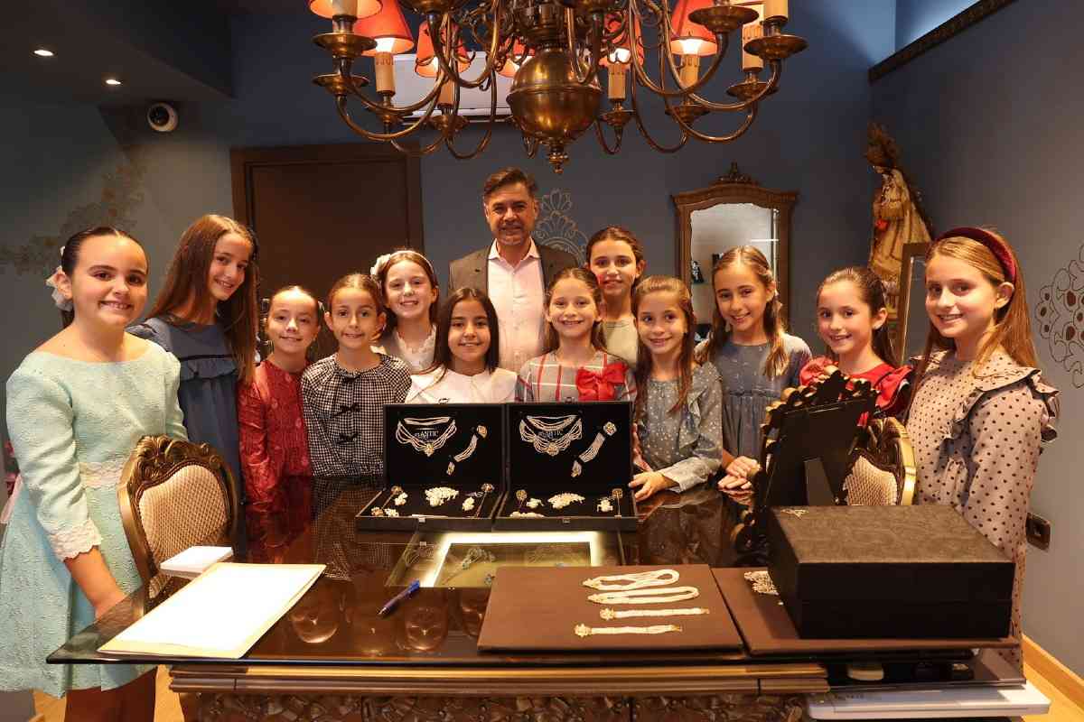 La sede de la firma de joyería artesana Art Antic recibió días atrás la visita de Carmen Prades y Marta Mercader, junto a sus Cortes de Honor. Los hermanos Pepe y David Alabadí atendieron a las representantes falleras, quienes se tomaron medidas con el objeto de ajustar las piezas de sus aderezos oficiales. Y es que, desde 2001, Art Antic es la encargada de los aderezos oficiales de las Falleras Mayores de Valencia y sus Cortes de Honor y desde 2010 de las piezas que lucen con los segundos trajes oficiales.