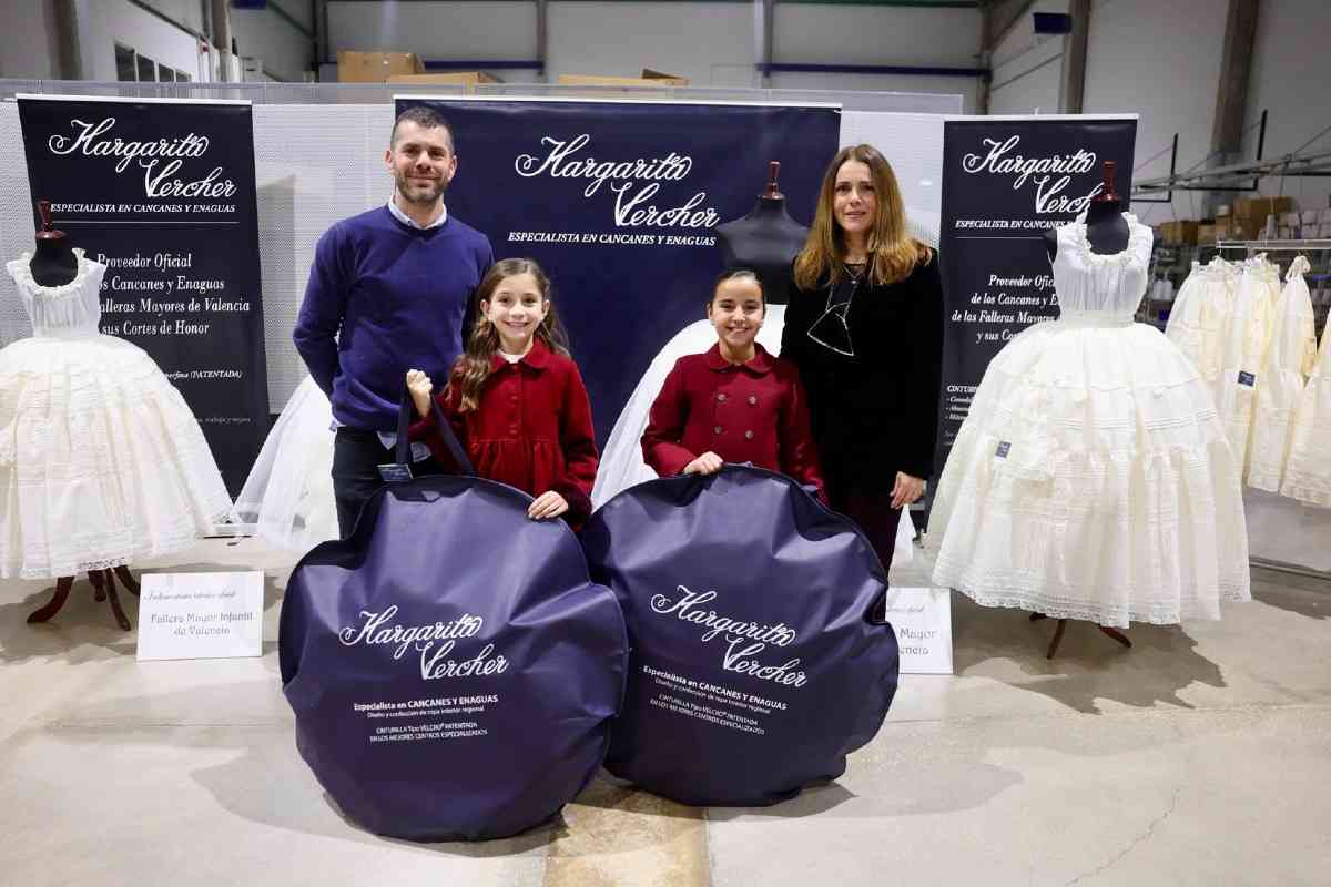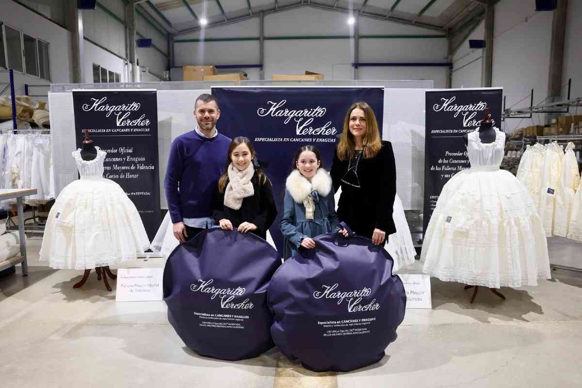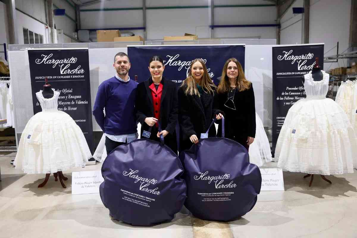 La firma Margarita Vercher realizó ayer tarde, en sus instalaciones de Algemesí, la entrega de los cancanes del primer traje de las Falleras Mayores de Valencia 2026. Asimismo, también son los responsables de las enaguas y camisas que lucirán las máximas representantes de la fiesta.