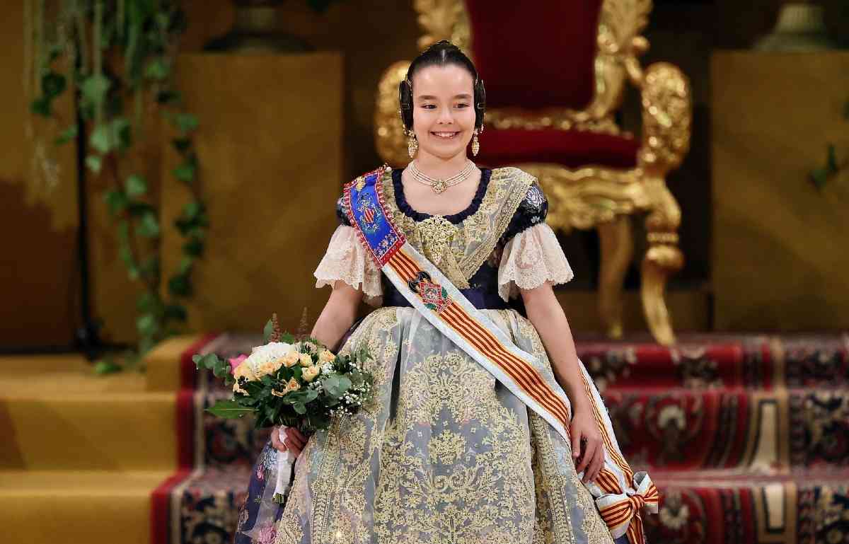 Antes de todo ello, tenía lugar otro de los momentos claves en este ritual de tradiciones, y que no era otro que la salida de su casa de la pequeña reina fallera, instante en el que todo el mundo podría averiguar el color elegido para su espolín oficial; un secreto plasmado en dos palabras: azul cristalino.