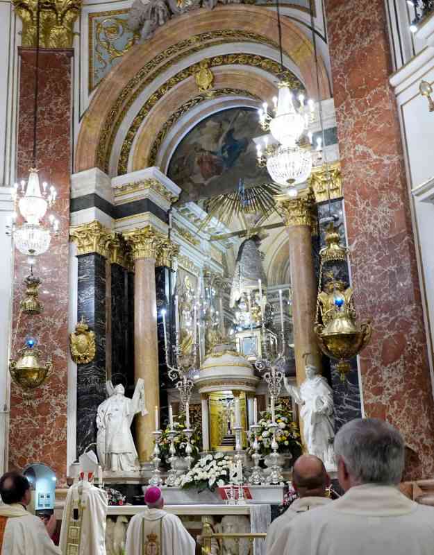 La imagen peregrina ha sido orientada hacia la Plaza de la Virgen, sin que haya abandonado en ningún momento el interior del templo.