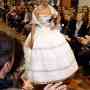 Nuria Llópis Borrego, Fallera Mayor Infantil de 2006 viste el tejido 1943 Carlet de los telares de José Bartual, complementado con la manteleta 1964 de Artesanías Viana, Mantilla de 3 picos 1975 de artesanías Valencia y la peineta de rodio 1985