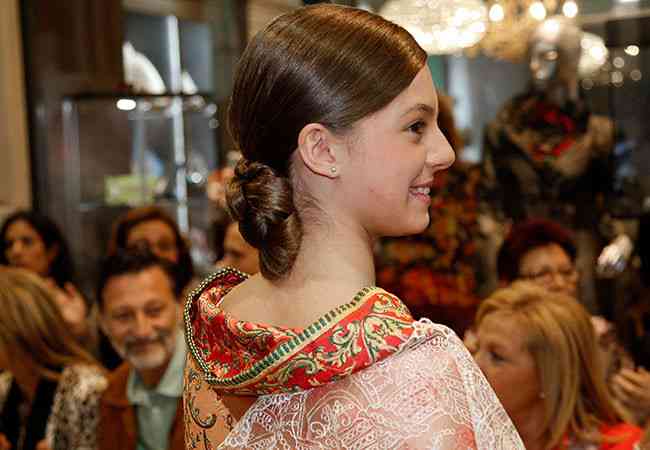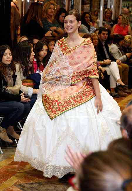 Inmaculada Escudero Asensi, Fallera Mayor Infantil de 2007, desfila con el tejido Roses de los telares de José Bartual junto al peinador 1970 de Adriluc y el mantón 1998 de seda natural. La enagua es la 1954 de hilo confeccionada por La llar del fil.