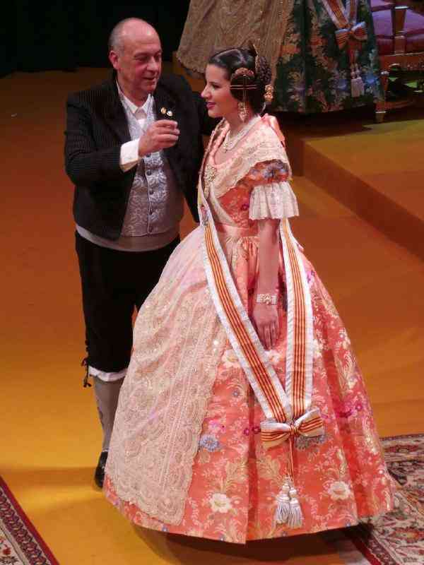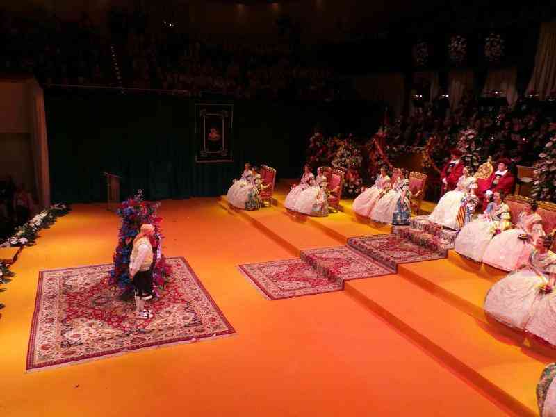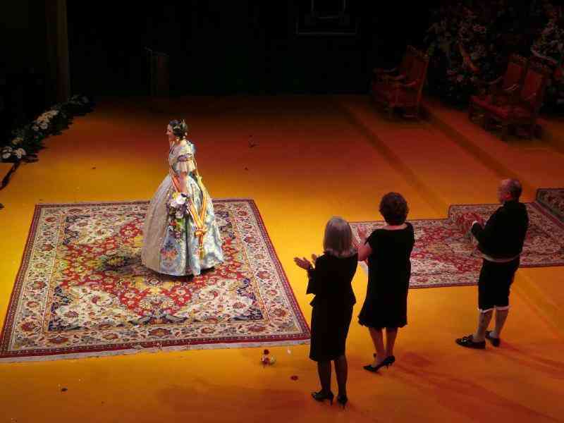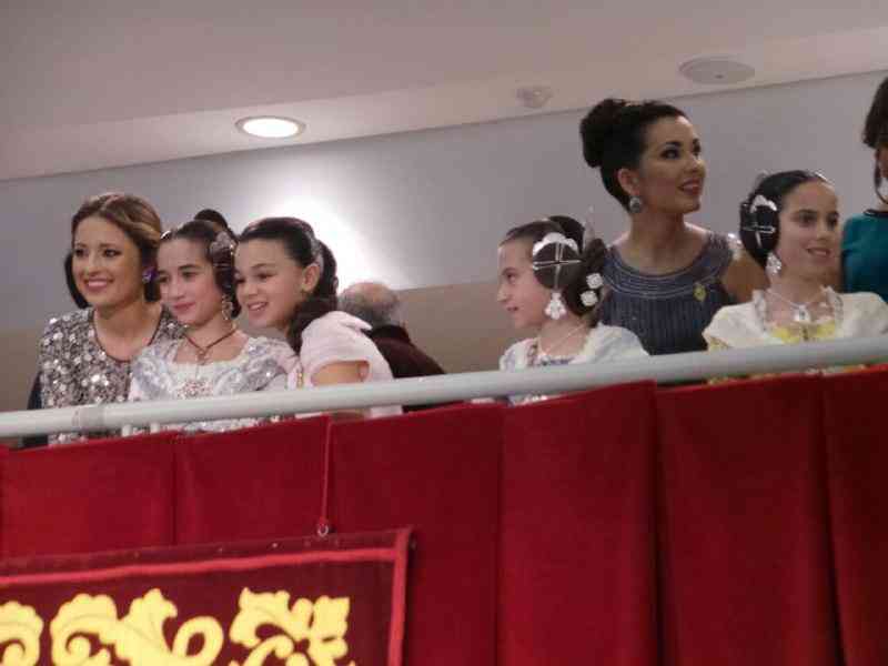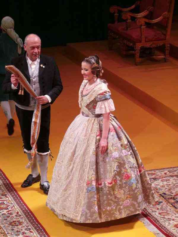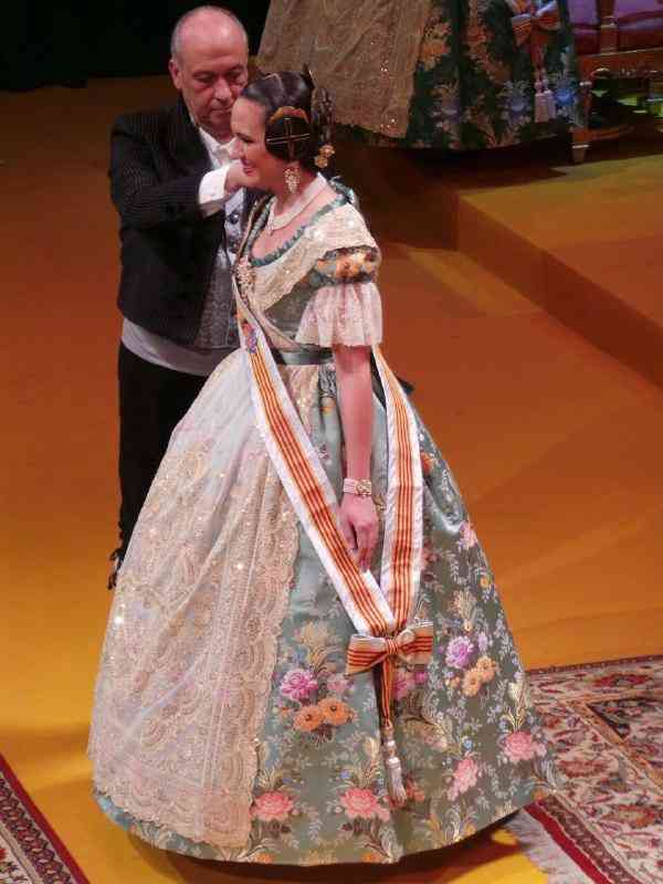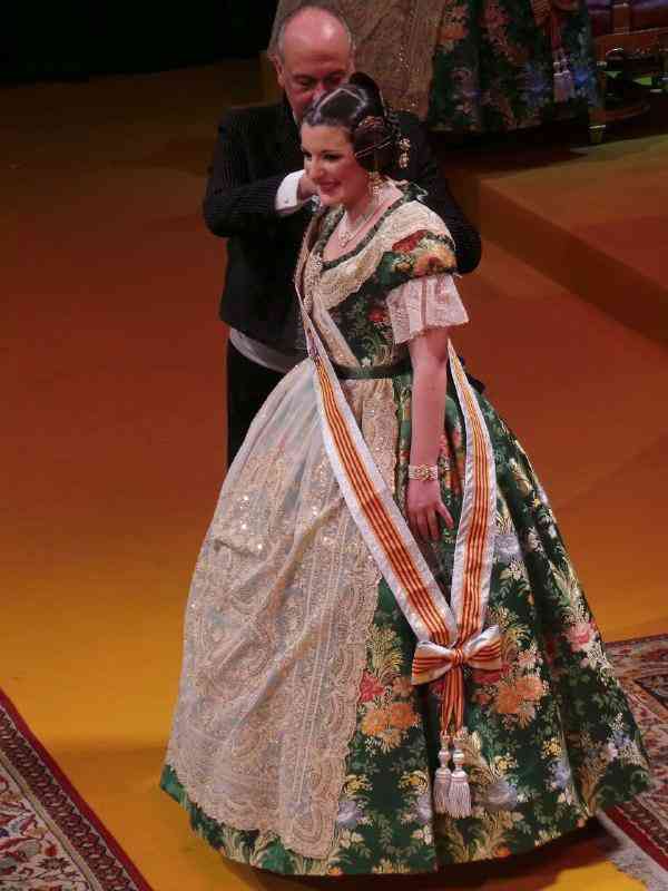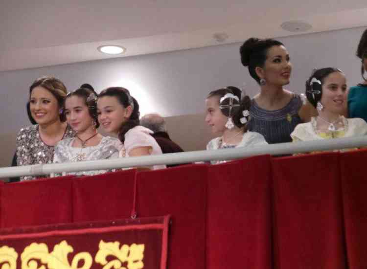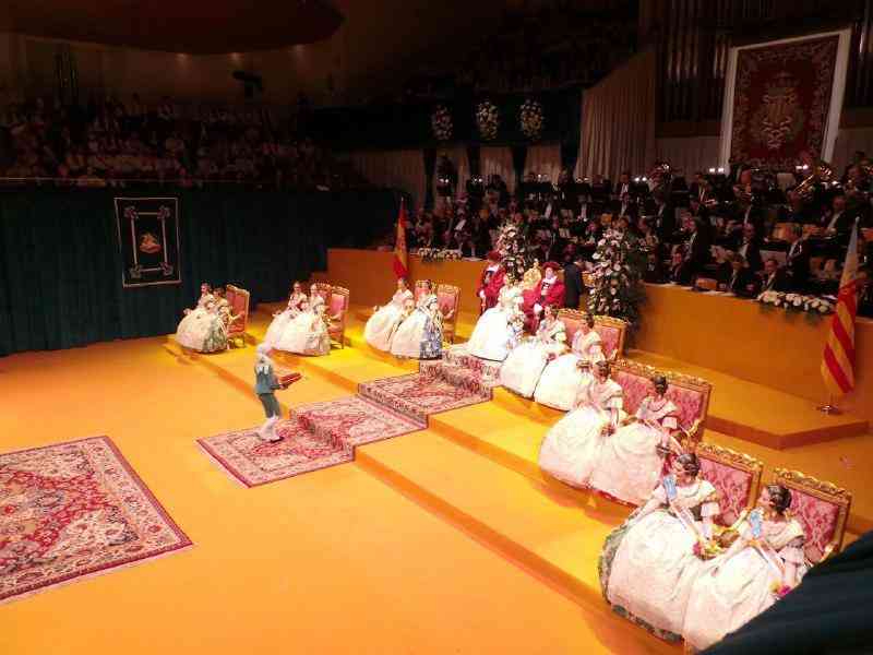 La Fallera Mayor de Valencia y la Corte de Honor, en el escenario del Palau.
