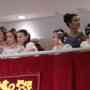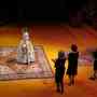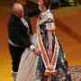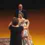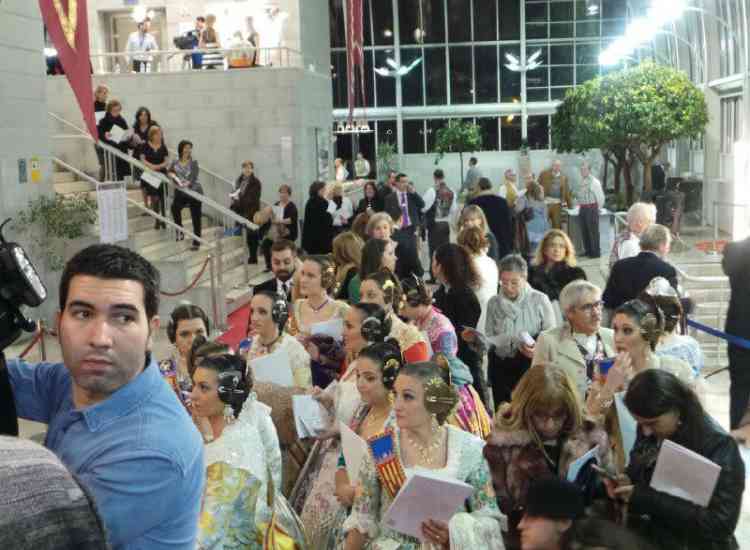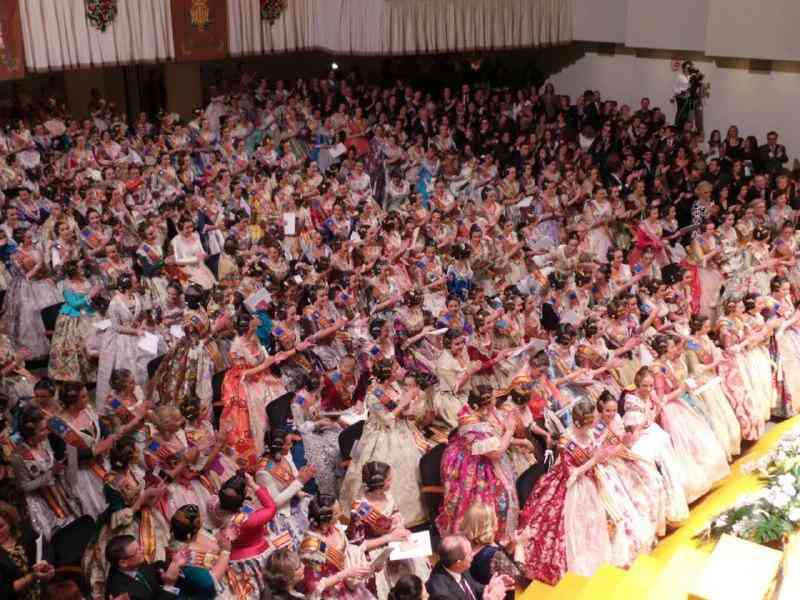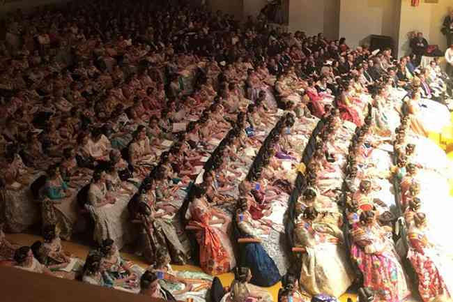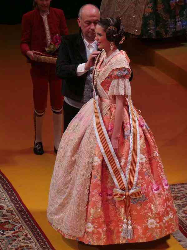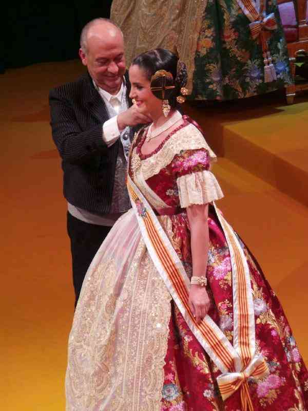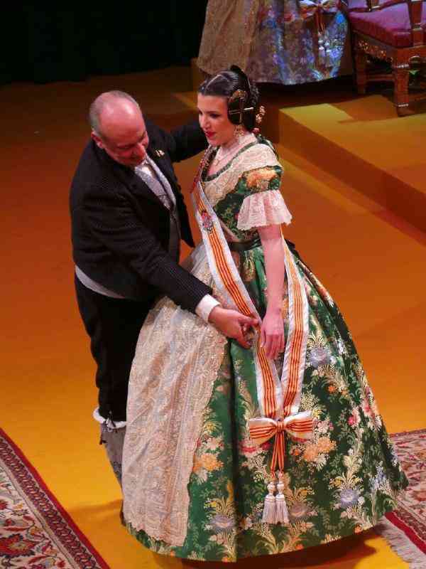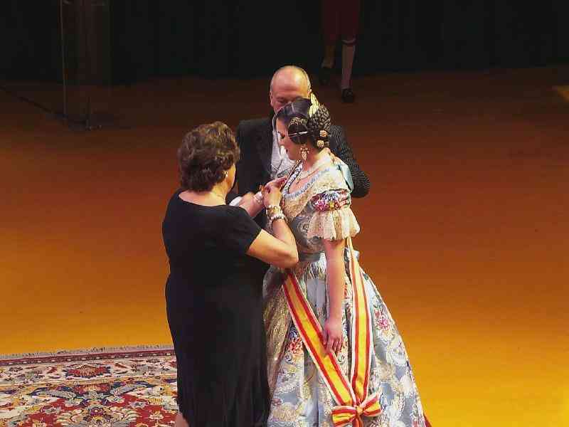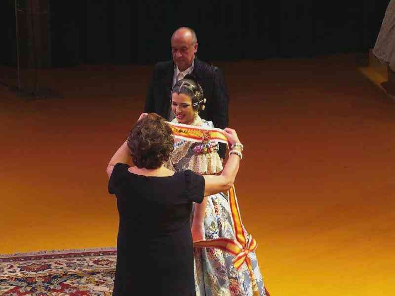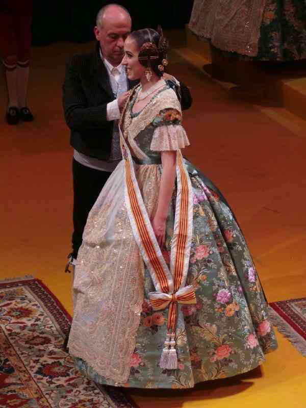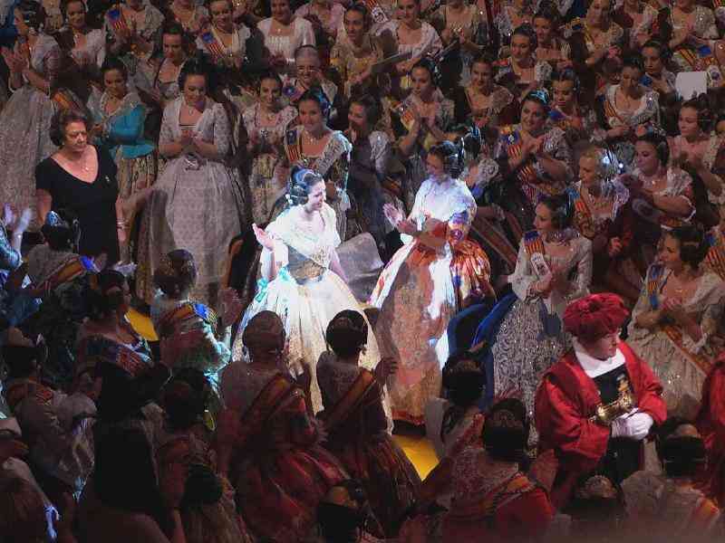 La Fallera Mayor de Valencia y la Corte de Honor, en el escenario del Palau.