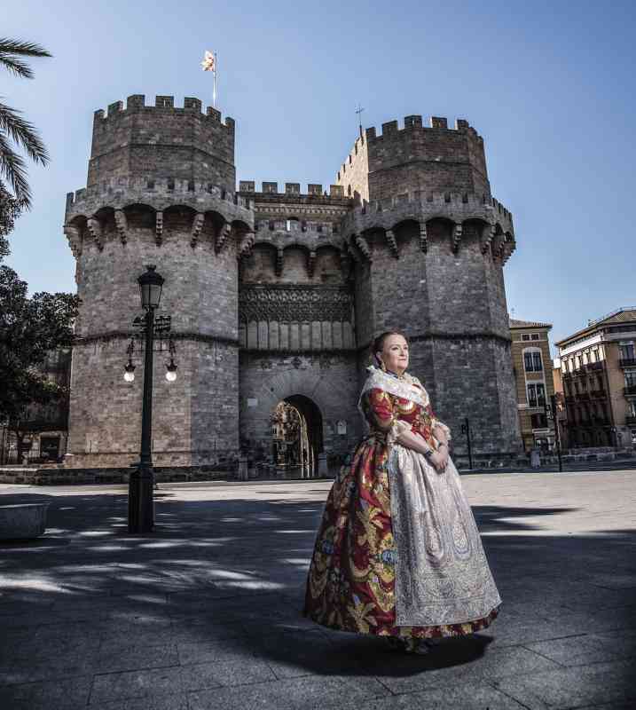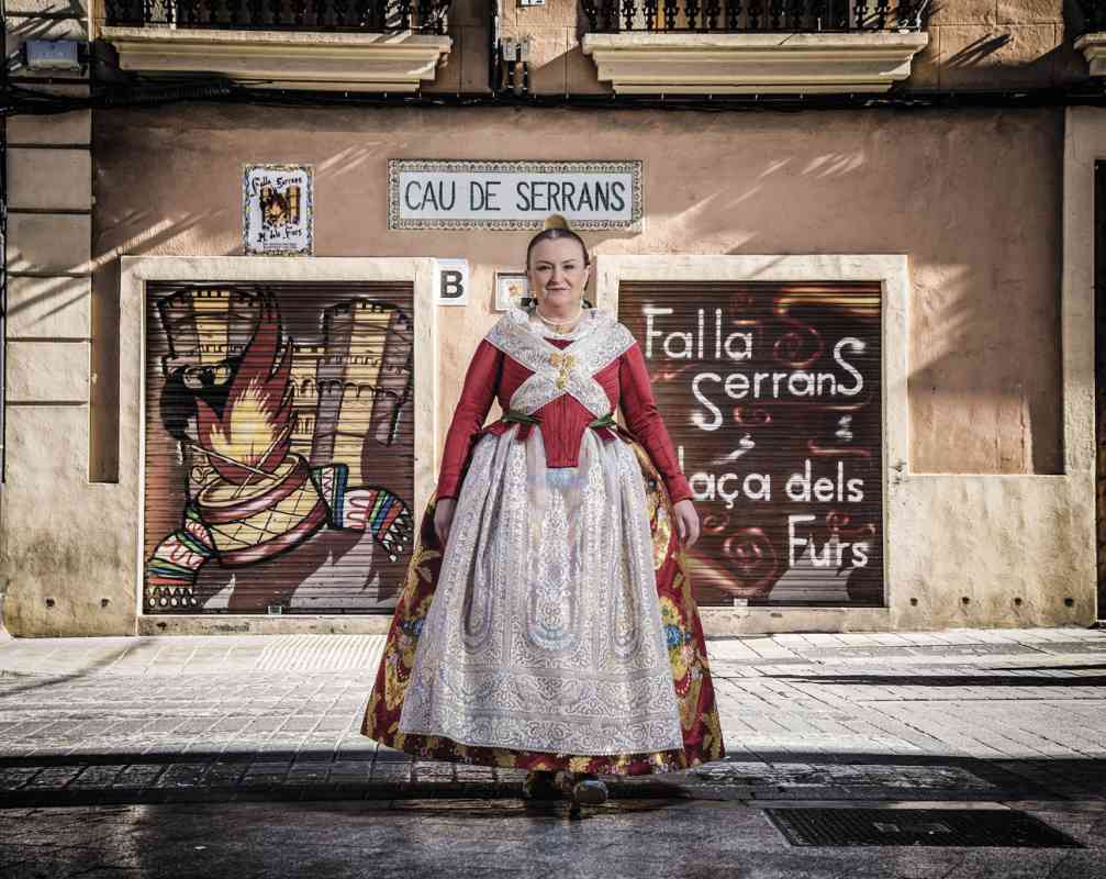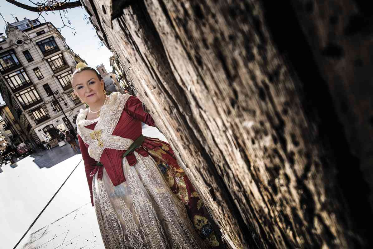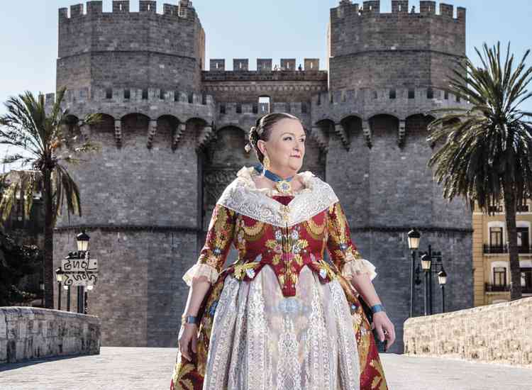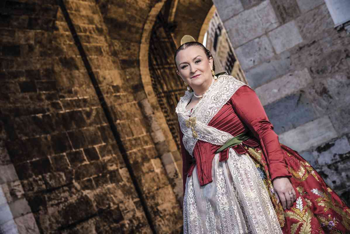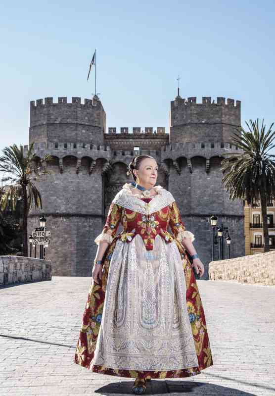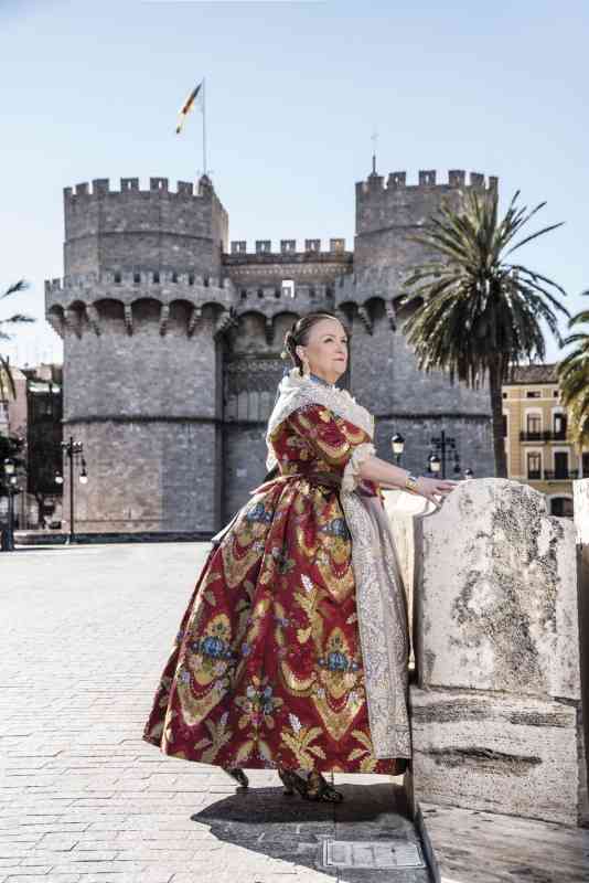 Amparo Prats Chacón, presidenta de la falla Serrans-Plaça dels Furs, viste un espolín Reina de la Compañía Valenciana de la Seda, en color Grana con tres metales diferentes y 35 colores de trama de color. Manteletas de Chelo Manteletas y puntillas de Juanma Me Encanta.