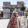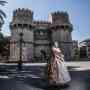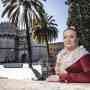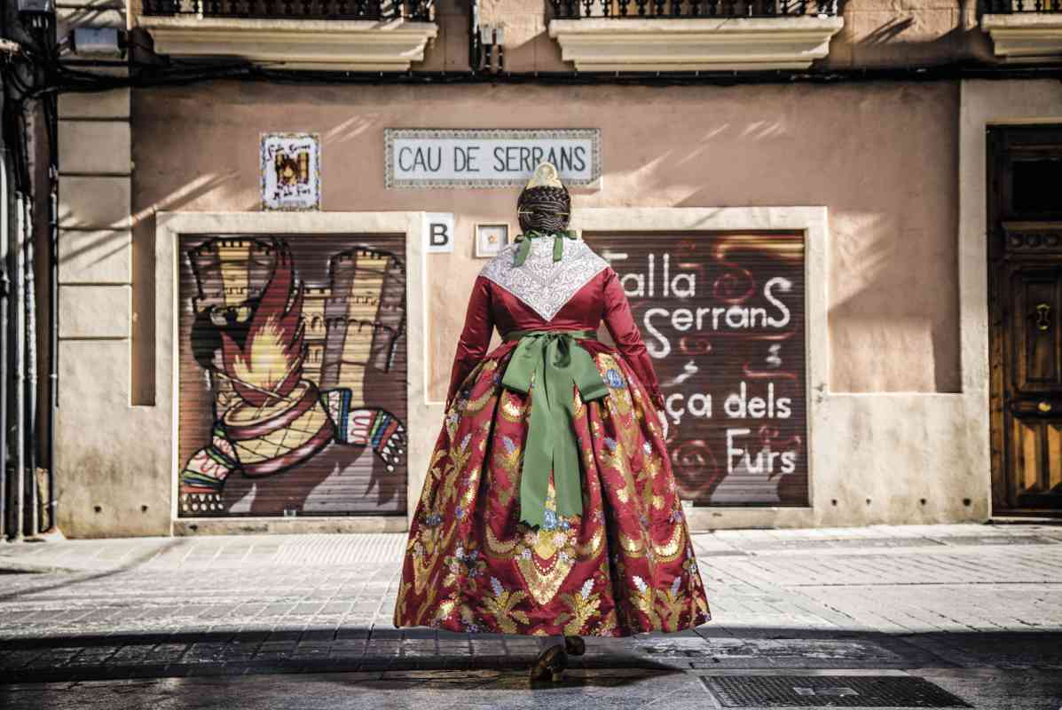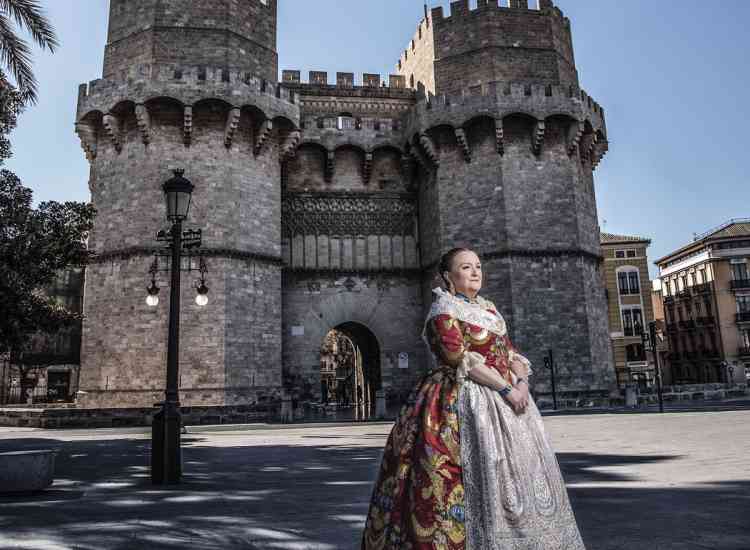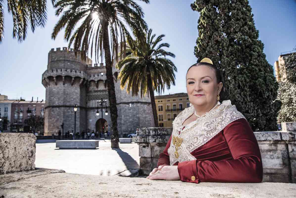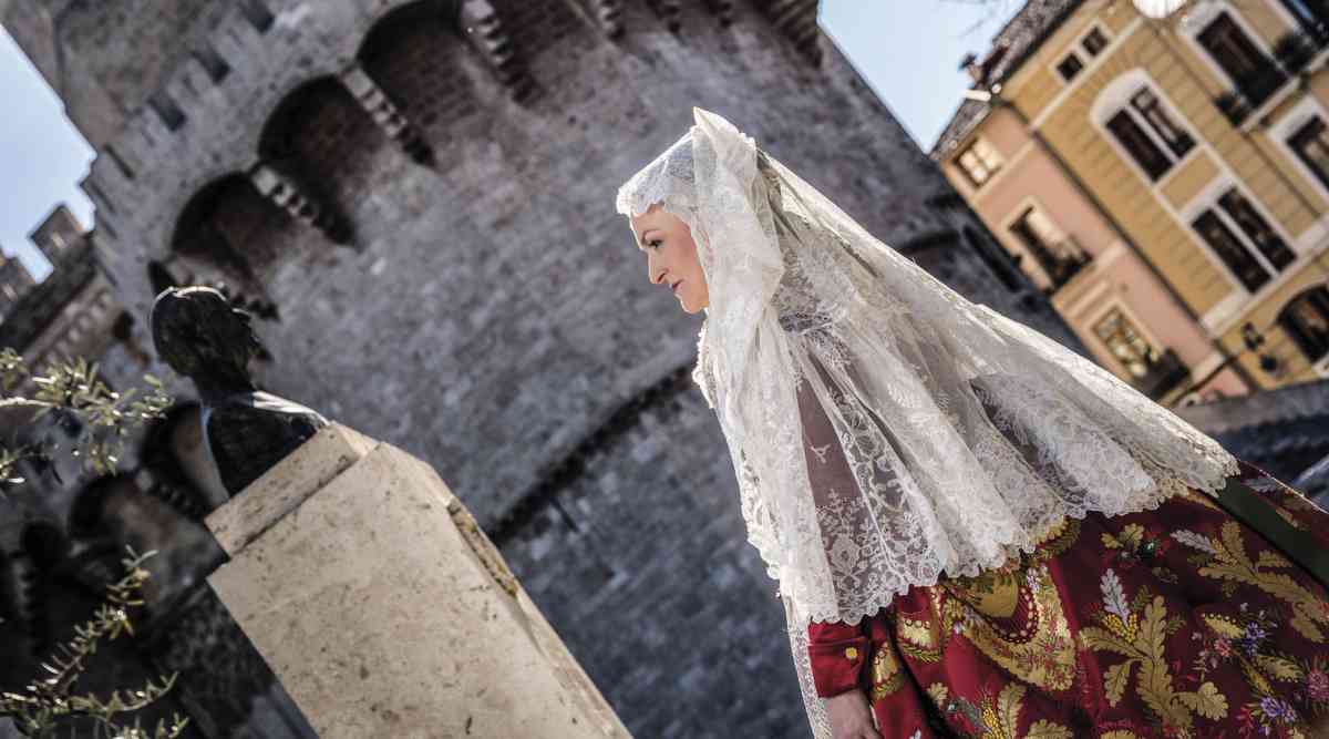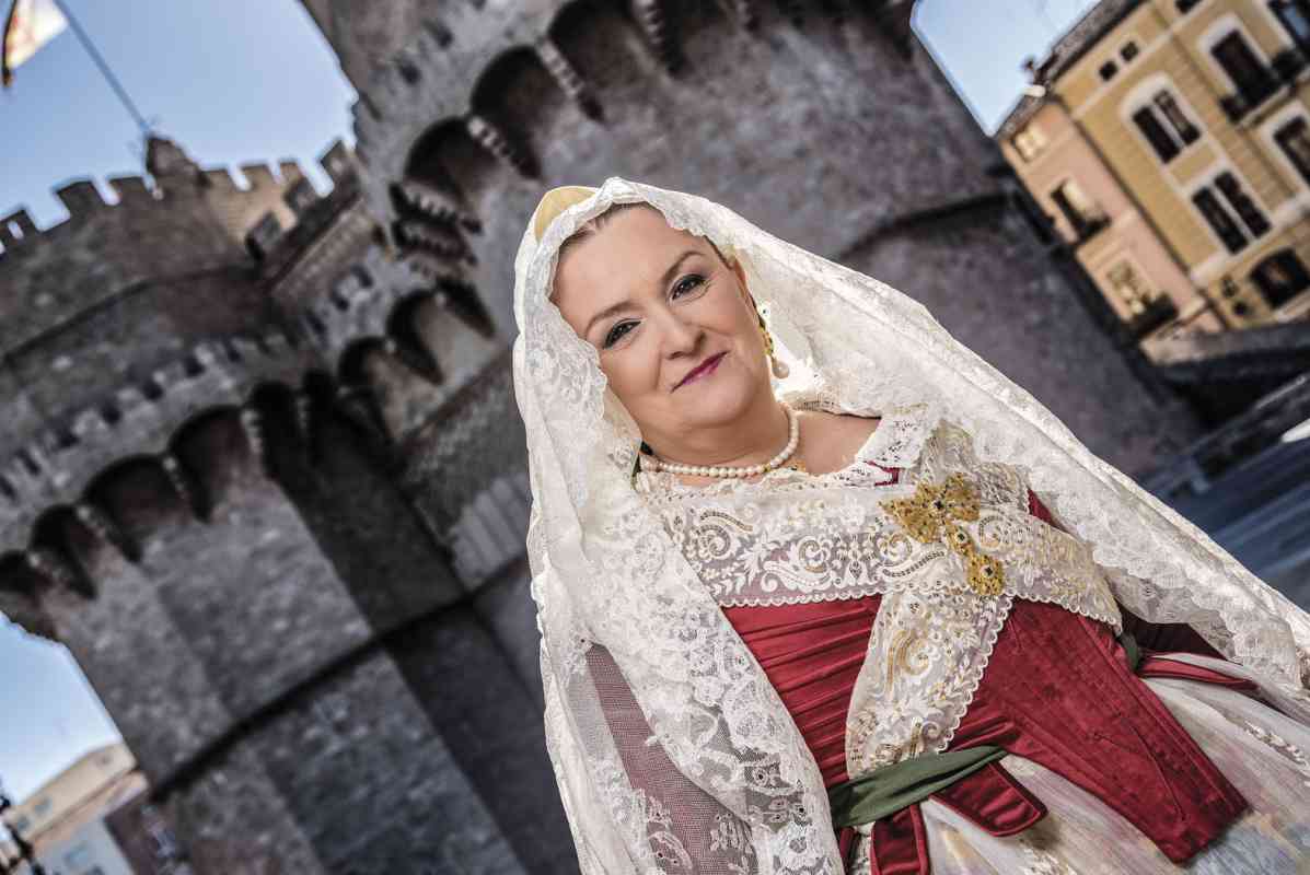 Amparo Prats Chacón, presidenta de la falla Serrans-Plaça dels Furs, viste un espolín Reina de la Compañía Valenciana de la Seda, en color Grana con tres metales diferentes y 35 colores de trama de color. Manteletas de Chelo Manteletas y puntillas de Juanma Me Encanta.