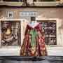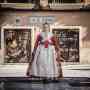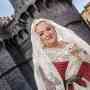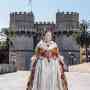 Con el cuerpo del S. XVIII, lleva pendientes de lámpara con relicario y pulseras a juego, todo en plata de 1ª ley y zafiros azules. Peineta de reproducción de principios del S. XVIII.
