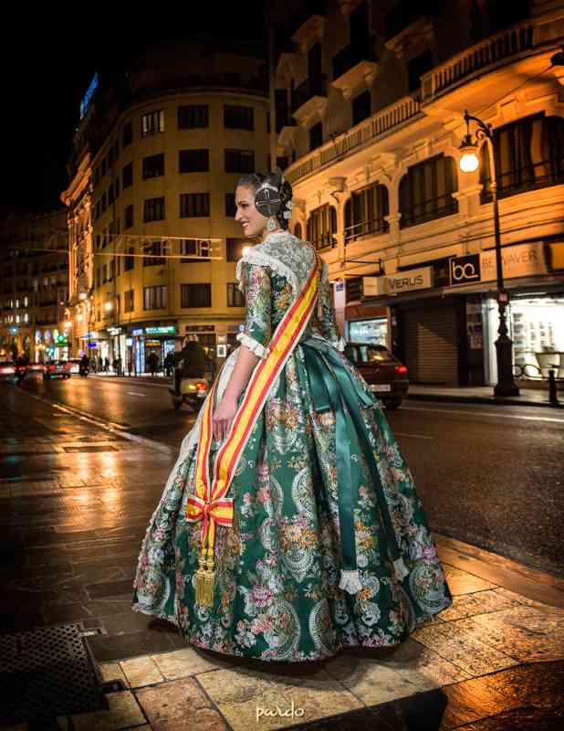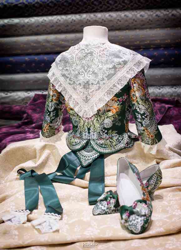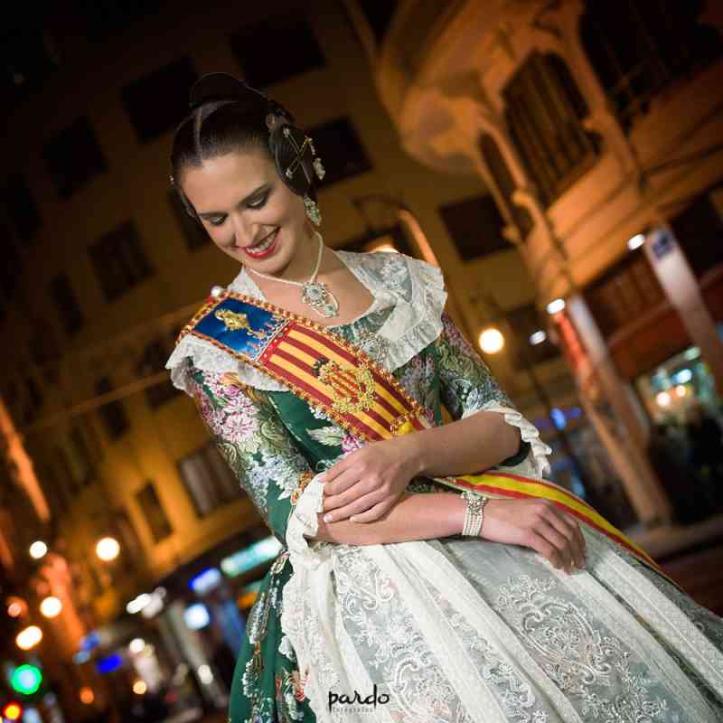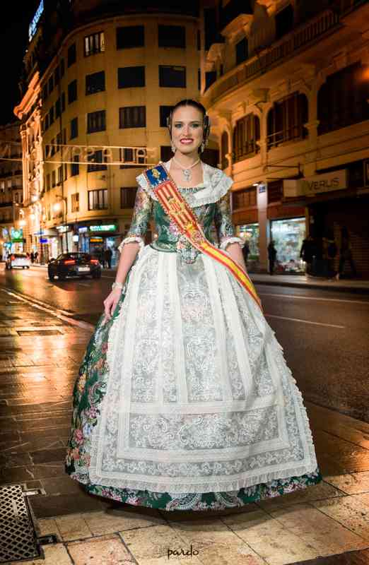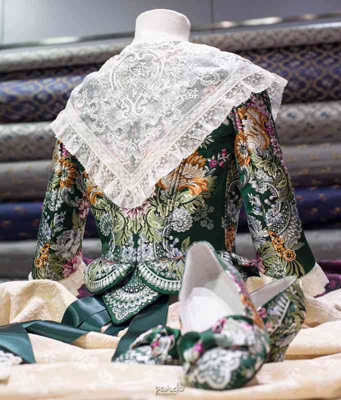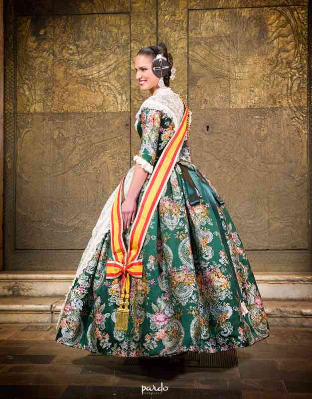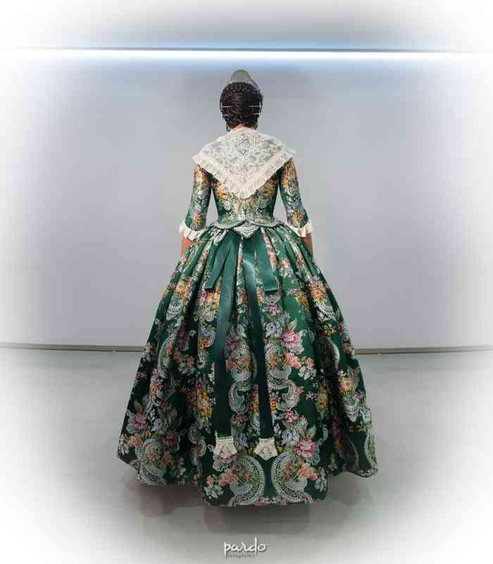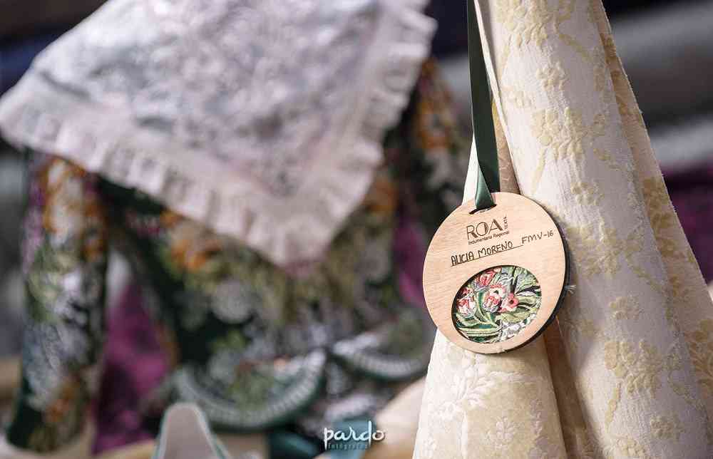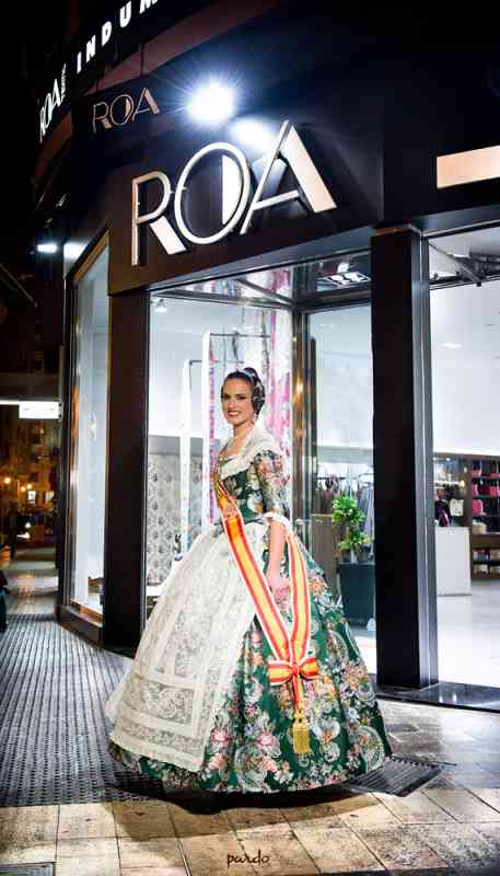 La Fallera Mayor de Valencia, Alicia Moreno Morales, lució para la Gran Gala Fallera una seda natural 100% de Vives y Marí, bautizada con el nombre de “Alicia”. El corte es un lampas, dibujo exclusivo de ROA, compuesto de 16 colores, nobleza en hilo blanco y metal plata envejecida. El estilo de dibujo es simétrico, donde destaca su ramo principal. Está trabajado como los espolines antiguos, perfilado en negro para darle profundidad a las flores, todo ello sobre un fondo verde primavera.
