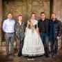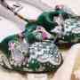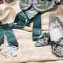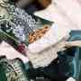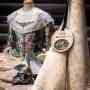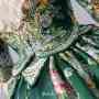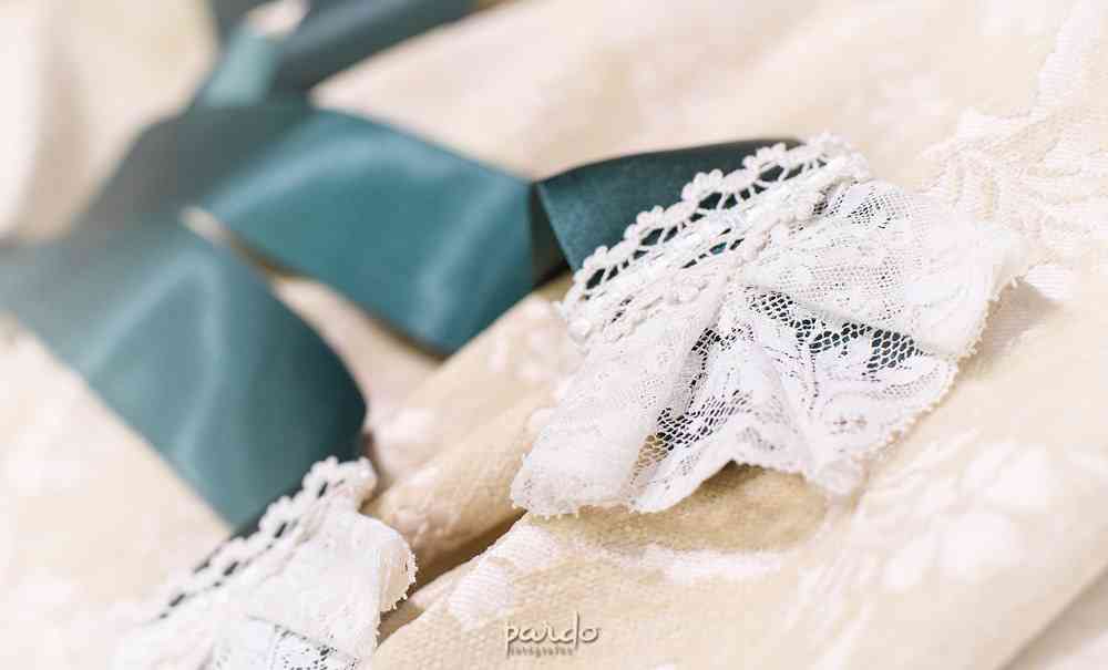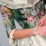 El aderezo es de Art-Antic, realizado en plata de ley, todo montado con perla natural cosida a la pieza en diferentes tamaños. Los centros son en piedra natural aventurina verde, haciendo juego con el traje. Destaca el broche y el colgante con unas perlas laterales.