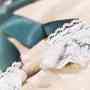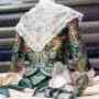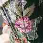 Sobre la tela, juego de pañuelo y delantal de la firma Artesanía Viana, bordados sobre seda rayada con hilo de seda marfil y lentejuela plata, compuesta por puntilla y entredoses de valencié formando líneas separando los bordados. El remate de la orilla está confeccionado con puntilla encañonada.