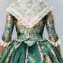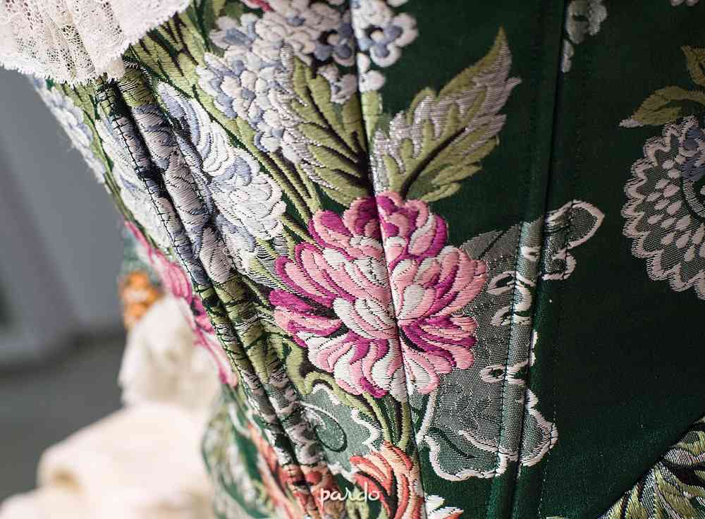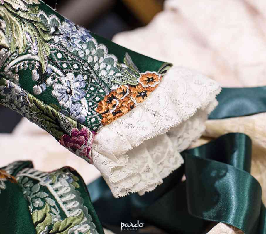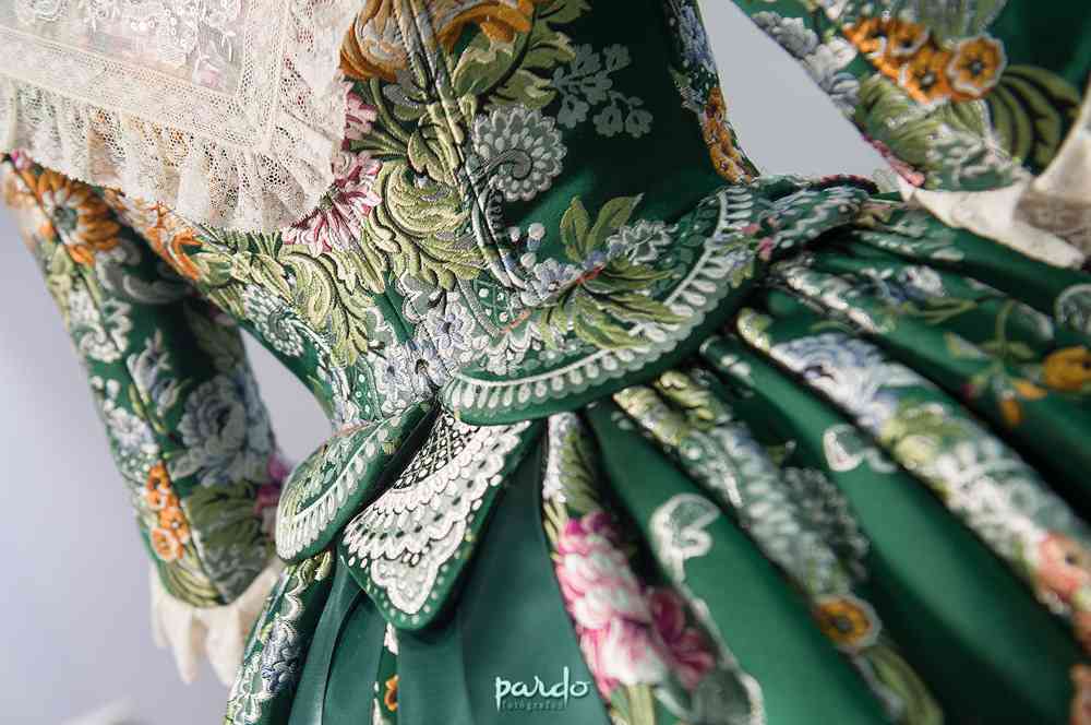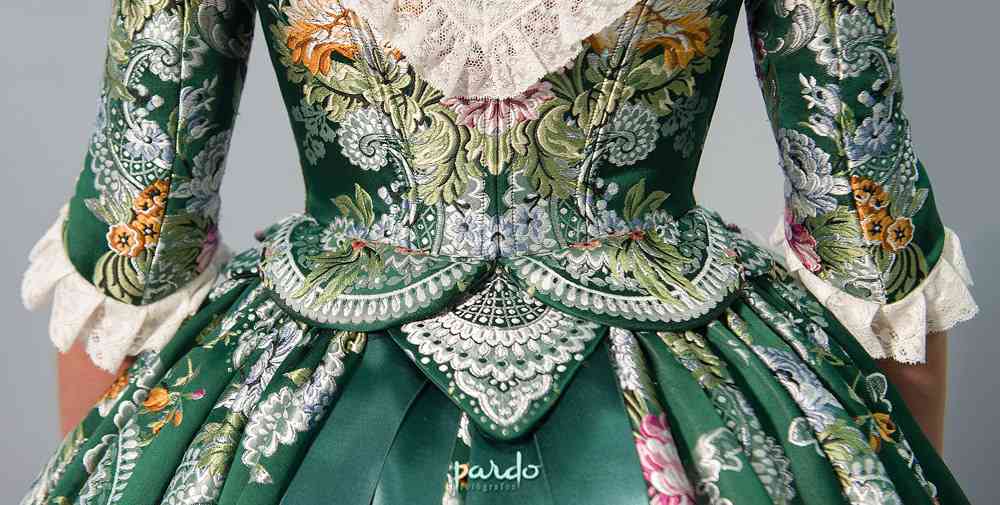 El traje confeccionado es un modelo del siglo XVIII, compuesto por jubón siguiendo un patrón antiguo de envarado interior. Destaca en la confección los dibujos del detalle de la cintura y el encaramiento de los centros en cada una de sus costuras.