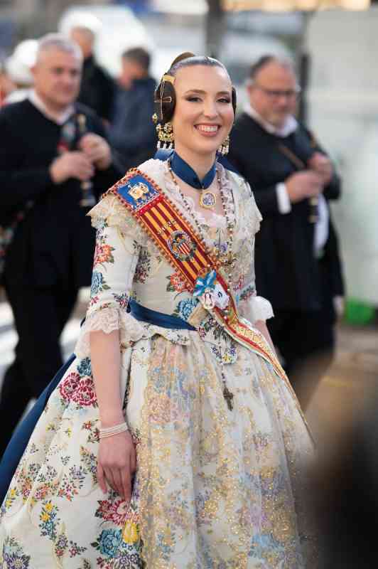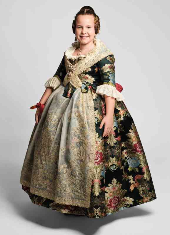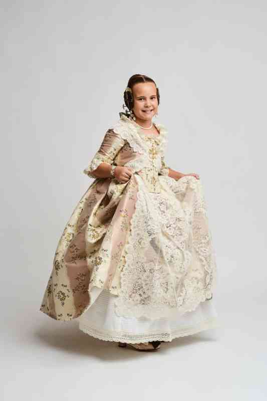 Aída Mora Ayuso viste una tela de las conocidas como “valencianas” en color blanco óptico. Jubón confeccionado al estilo siglo XVIII con volante y envarado no visto. Mocador y delantal en tul bordado a cadeneta en metal adornado con lentejuelas.