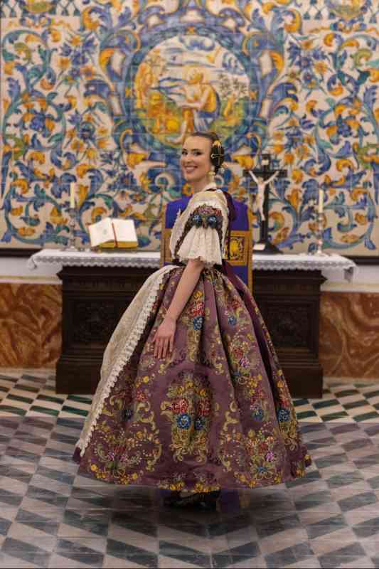 Aída Mora Ayuso luce una seda modelo Sonrisa en color uva de Vives y Marí confeccionado del siglo XIX. El “mocador de coll” y el delantal son de organza rústica bordado a cadeneta con hilo de oro y guarnecidos con encajes de alensón.