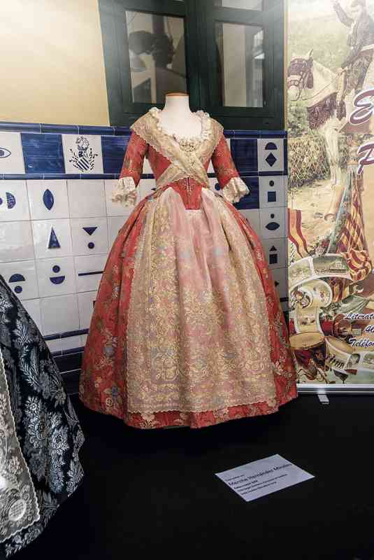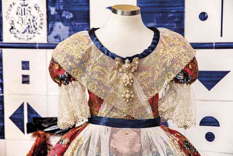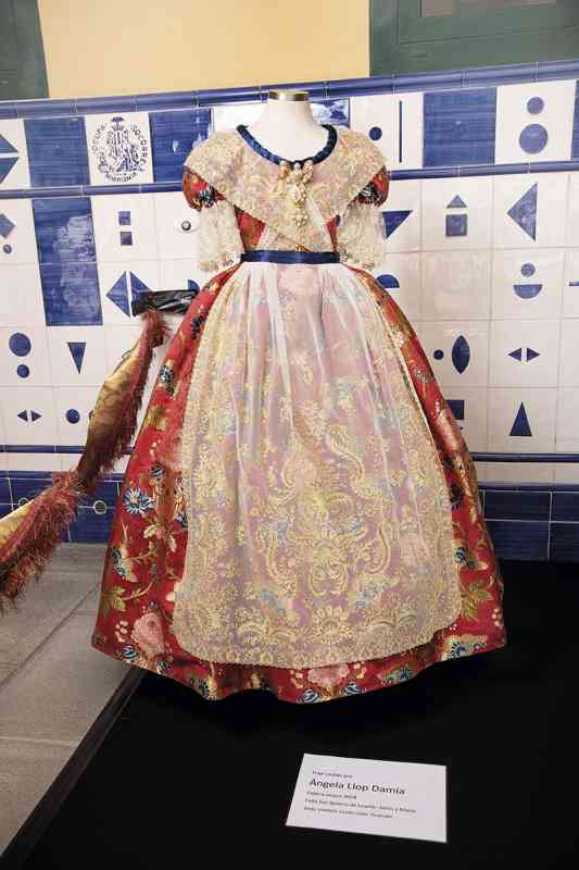 Traje cedido por Ángela Llop Damiá, fallera mayor de San Ignacio de Loyola-Jesús y María, con el tejido Lidón rojo.