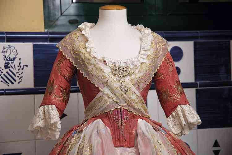 Traje cedido por Rocío Gil Uncio, Fallera Mayor de Valencia, con el tejido Eva en color salmón.