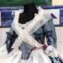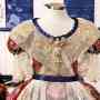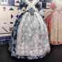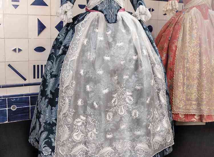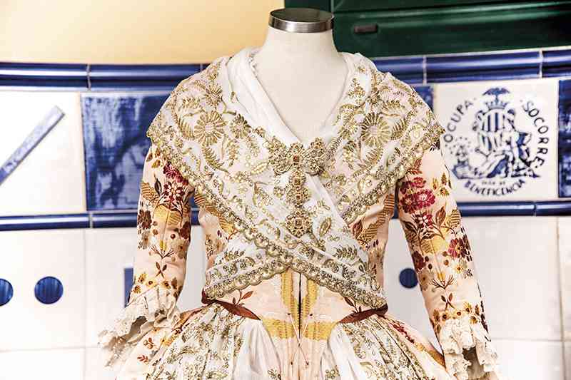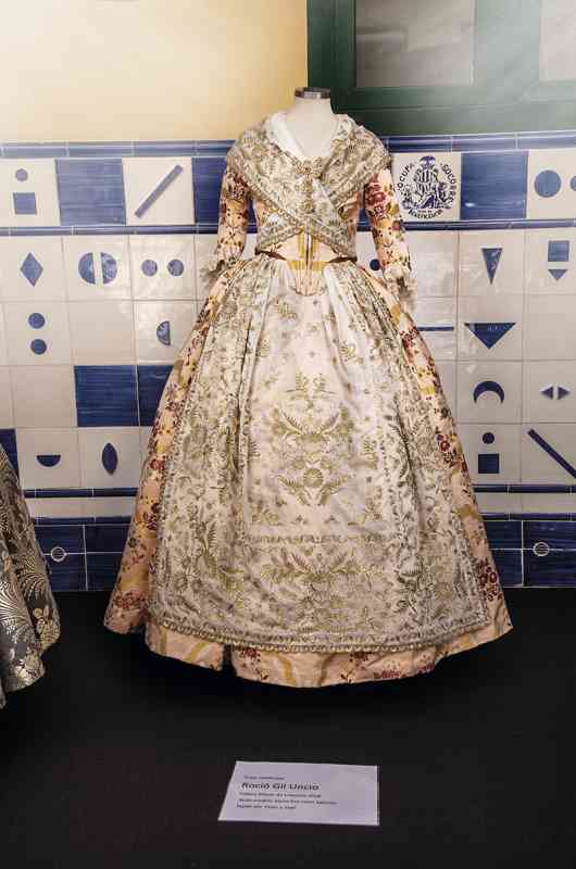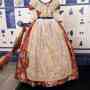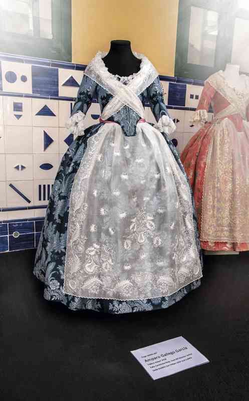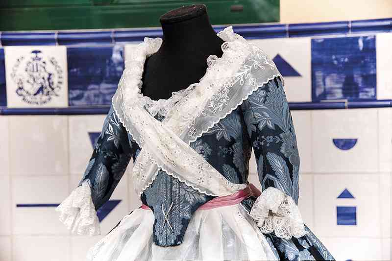 Traje cedido por Amparo Gallego García, fallera mayor de Ceramista Ros-José María Mortes Lerma, con el tejido San Felipe en azul y plata.