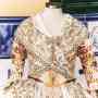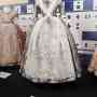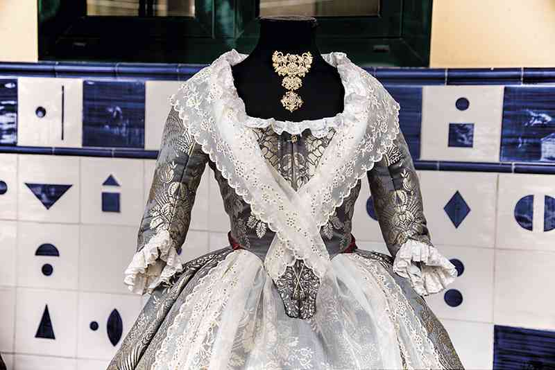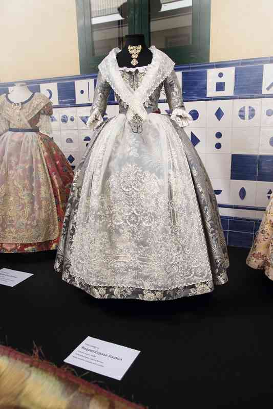 Traje cedido por Raquel Espasa Ramón, fallera mayor de la falla Alberique-Héroe Romeu, con el tejido Cenefas en color gris plata.