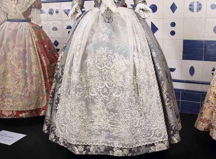 Traje cedido por Raquel Espasa Ramón, fallera mayor de la falla Alberique-Héroe Romeu, con el tejido Cenefas en color gris plata.