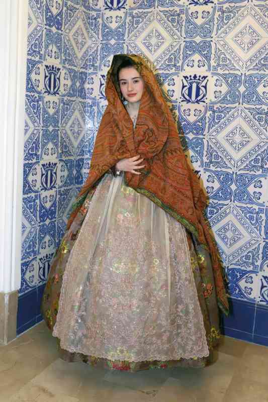 Lourdes Montesinos viste un guardapiés brocado en color castor y jubón al tono de manga larga con volante. El pañuelo y delantal, bordados a cadeneta en oro de color rosado. Se acompaña de un mantón alfombrado del XVIII en espolín de colores tierra con la araña, o parte central, en negro.