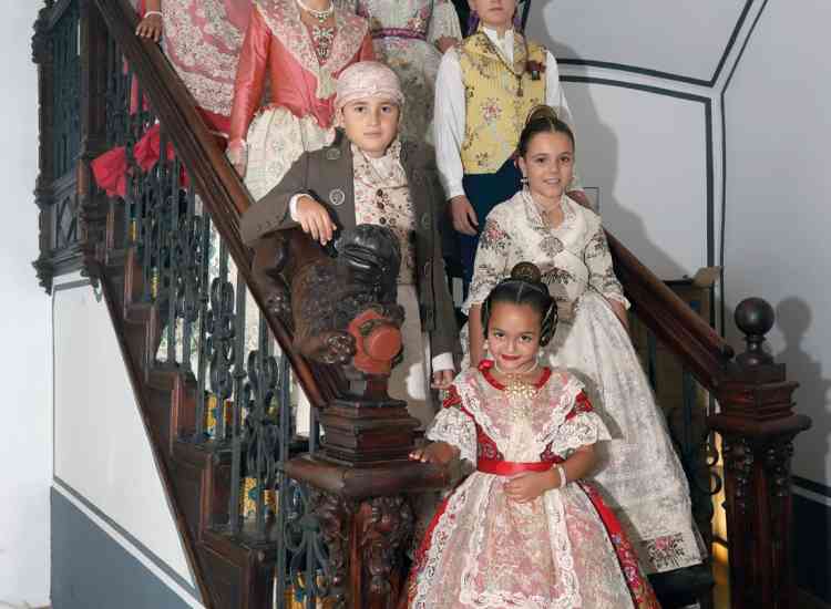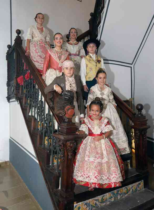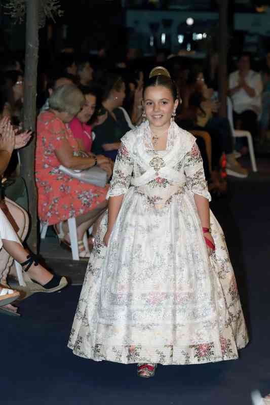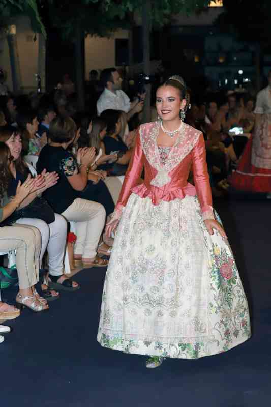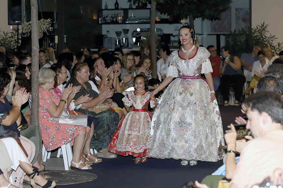 Traje realizado con el espolín Mediterráneo en color blanco. Manteletas con hilo en plata de ley, y traje de seda natural roja con el dibujo modelo Paula, exclusivo de Les Barraques.