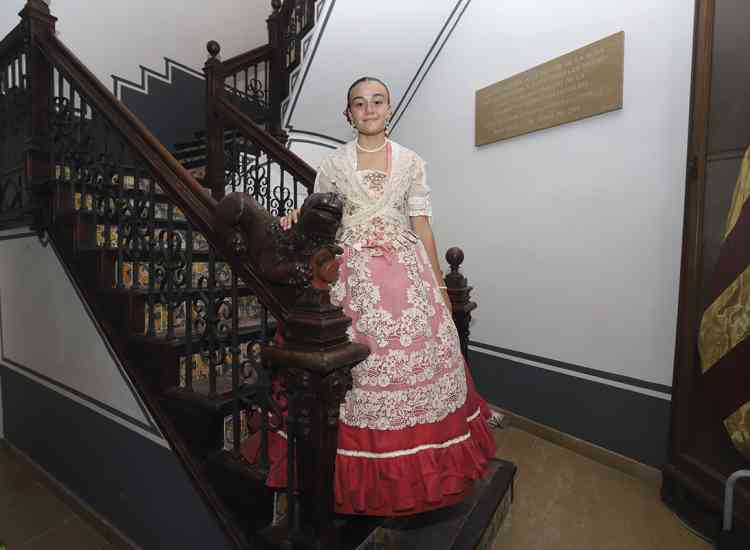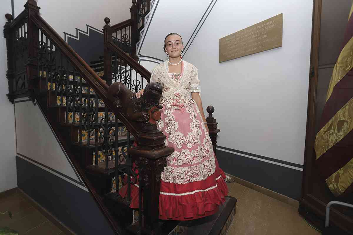 Traje de coteta, falda de color coral con volante y manteletas ovaladas. Coteta con flores de seda.