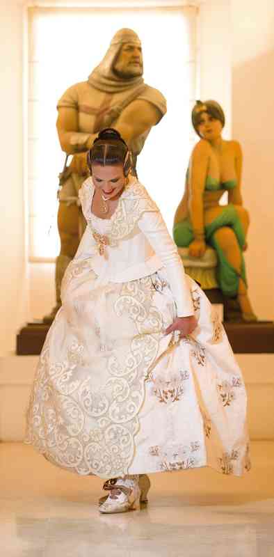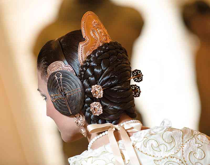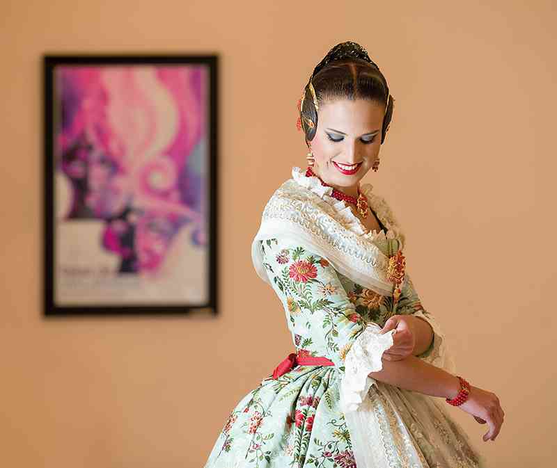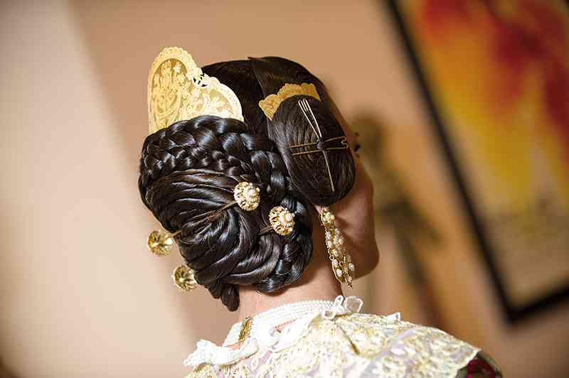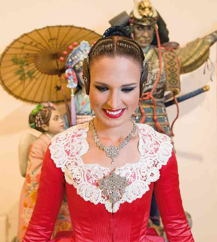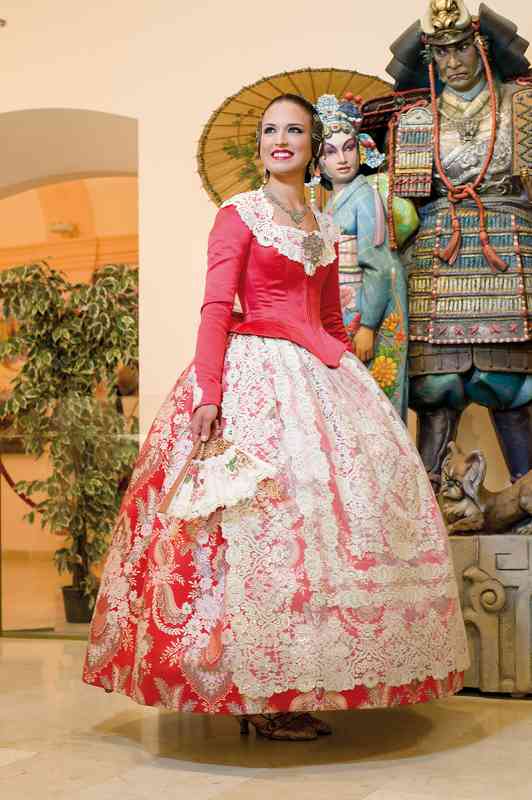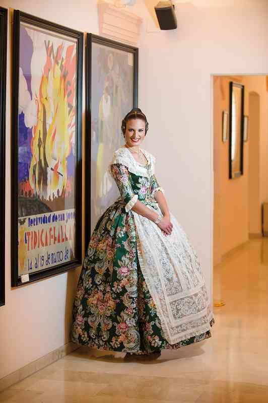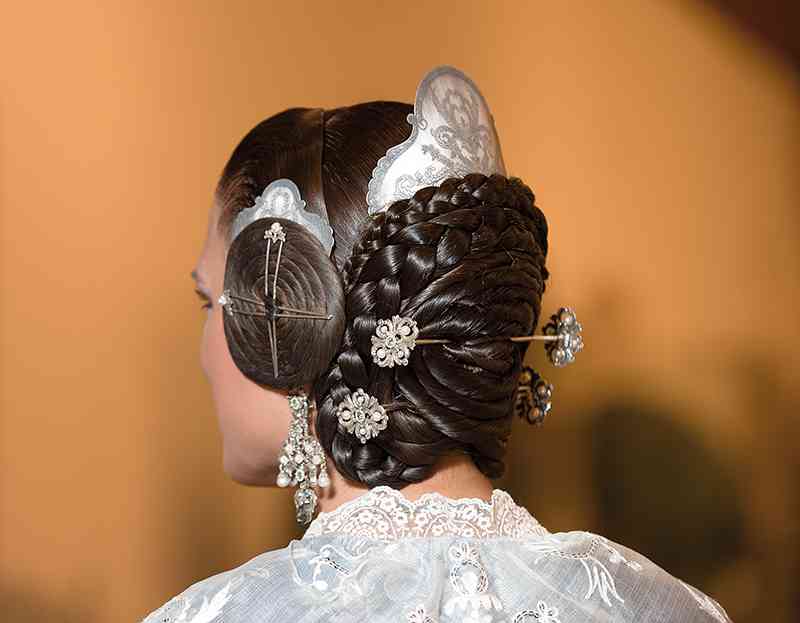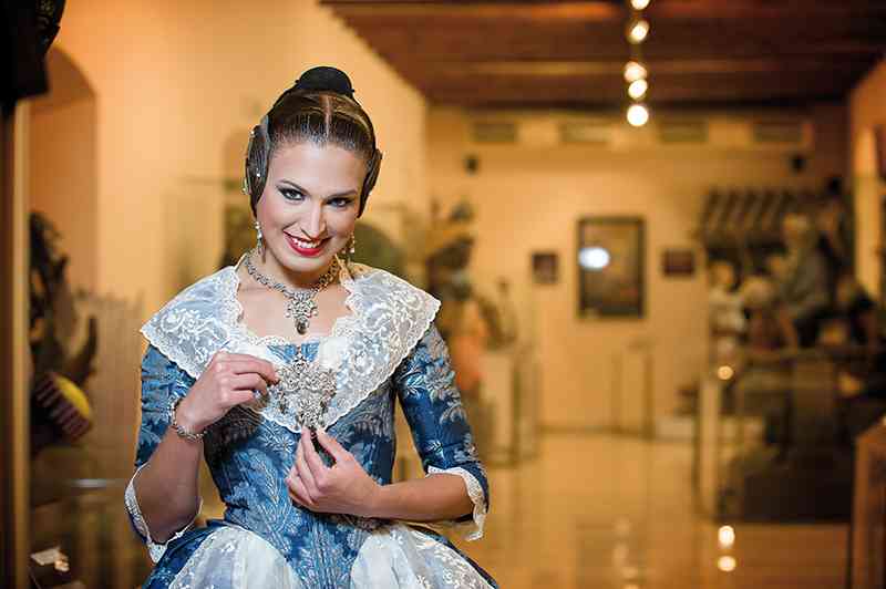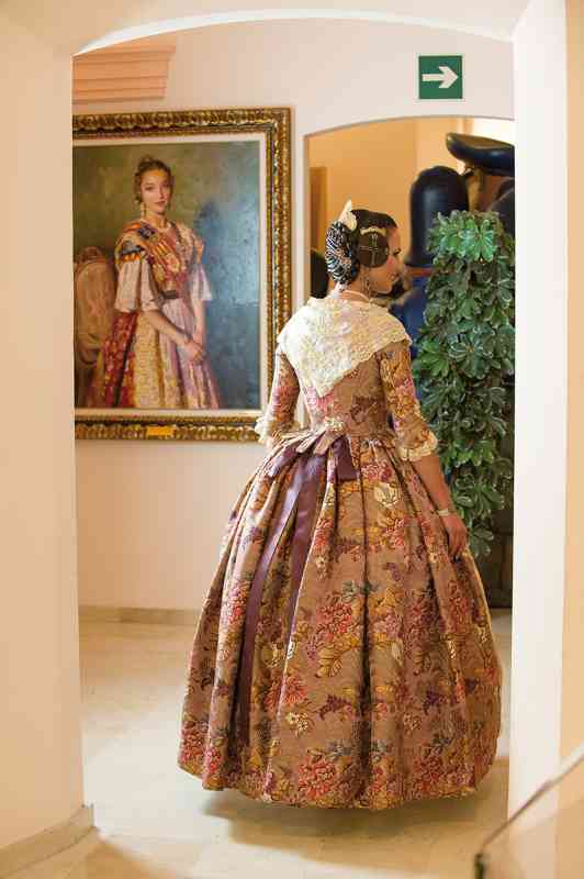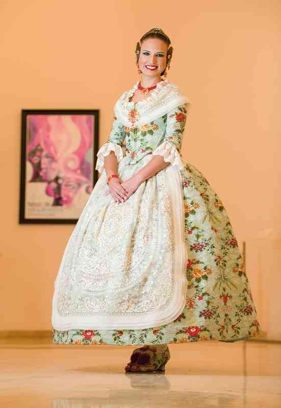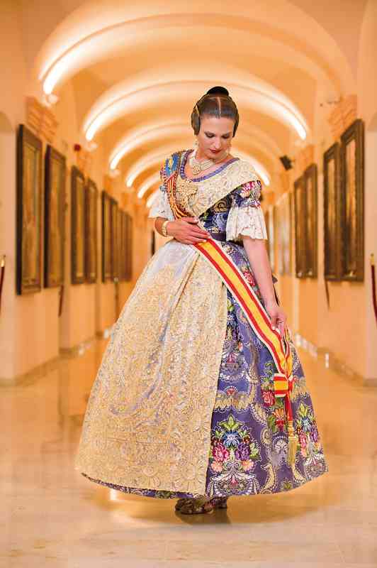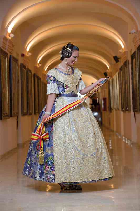 Roser y Consuelo también confeccionaron este traje, de estilo Siglo XVIII. Seda estrecha con el dibujo San Felipe en azul marino con metal plata. Manteletas de Artesanía Viana en seda y lentejuela plata. Aderezo de Art Antic en plata de ley con perlas naturales y cristales Swarosky en tono gris. Peinetas de Flor d’Aigua en plata envejecida con dibujo exclusivo.