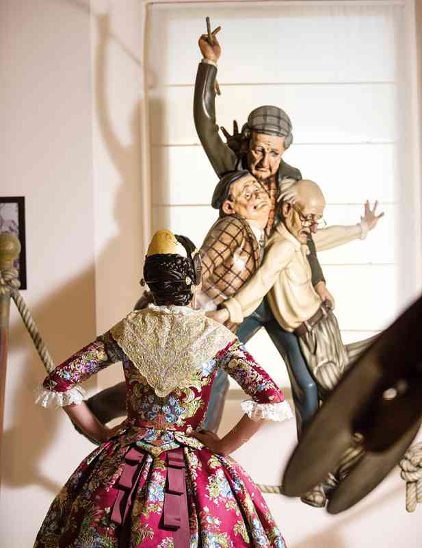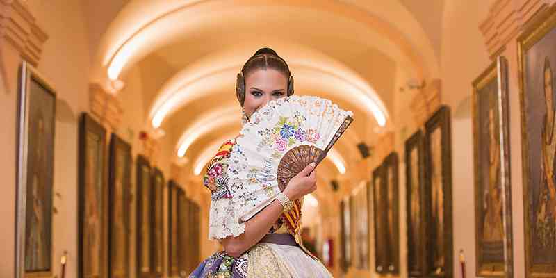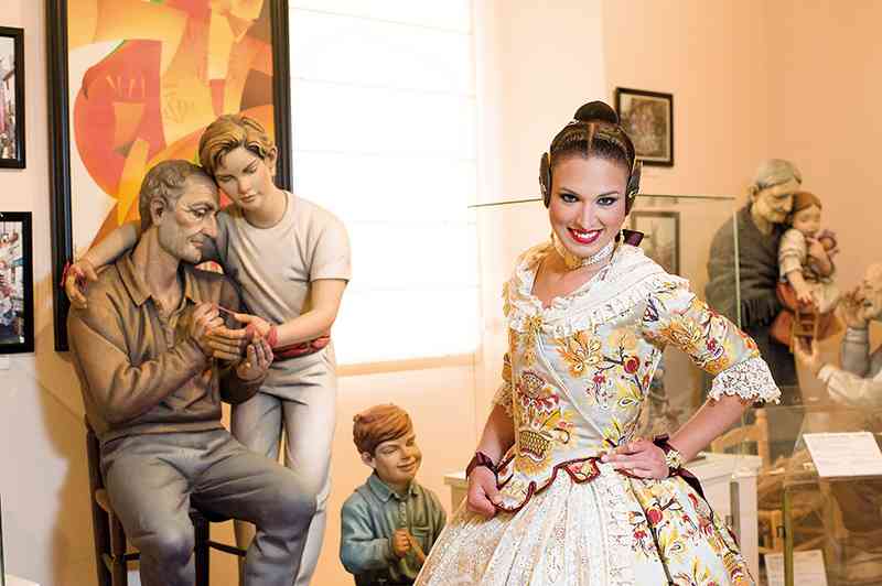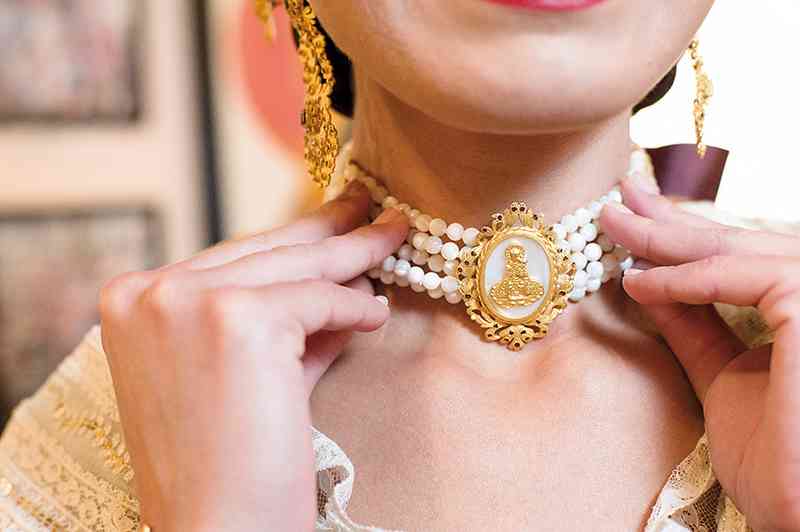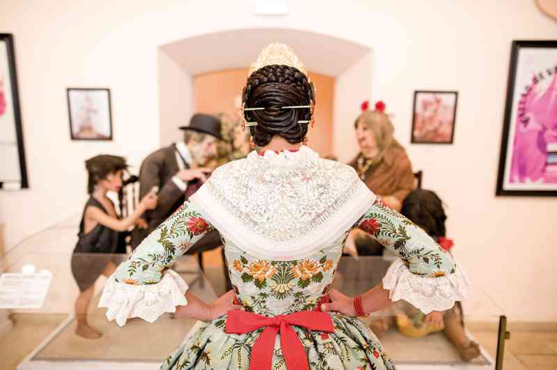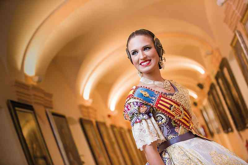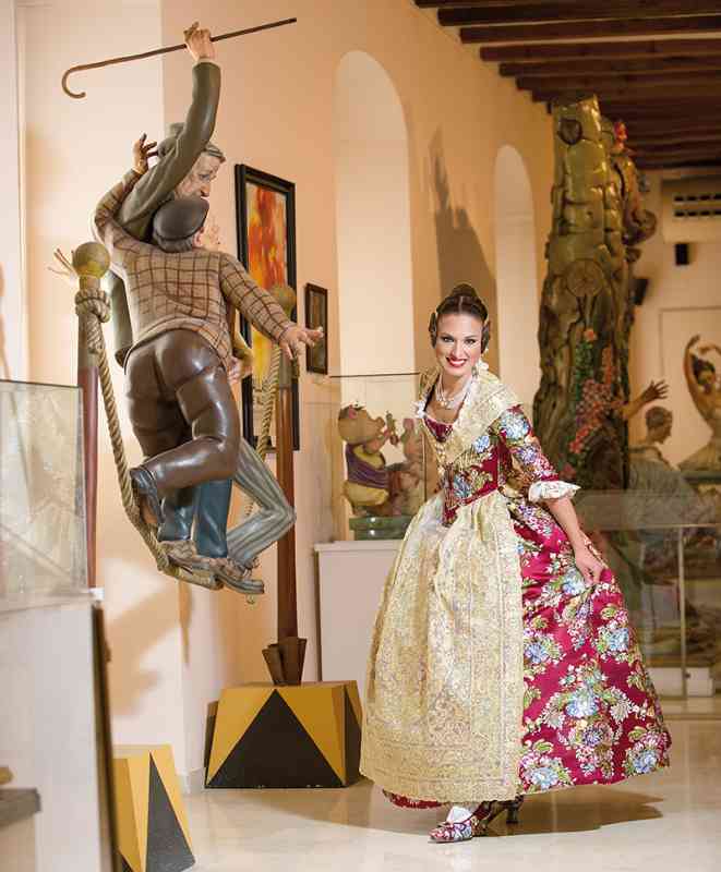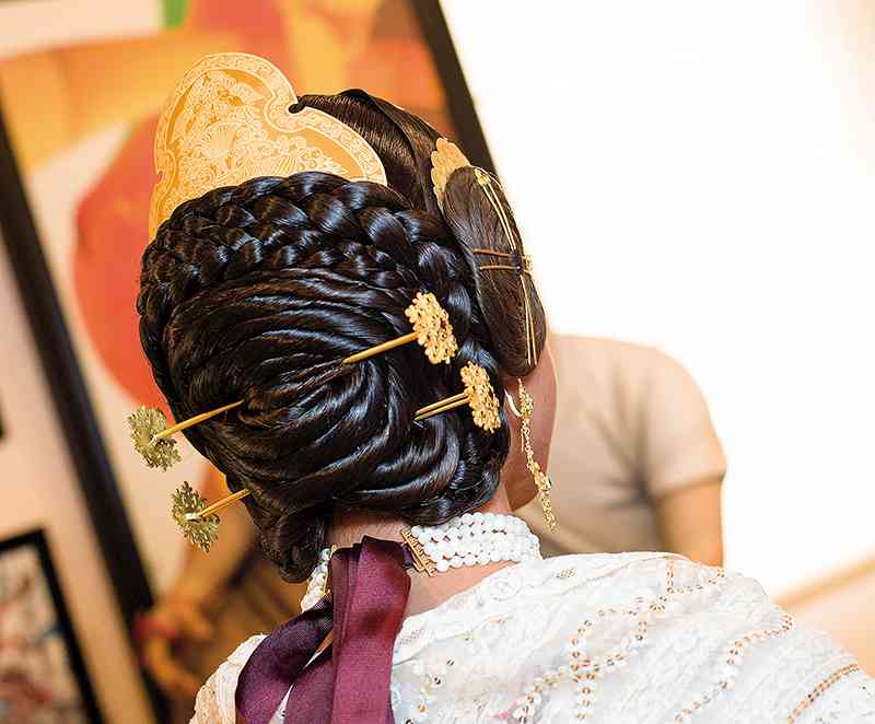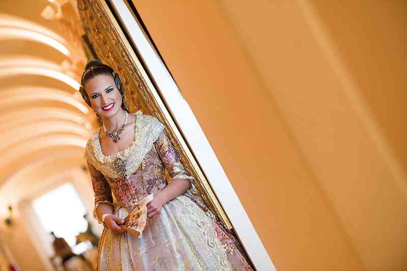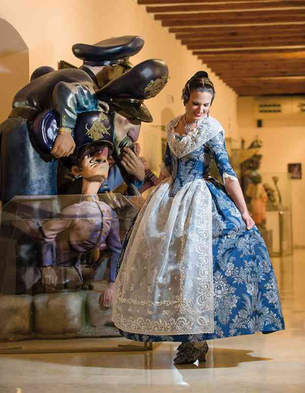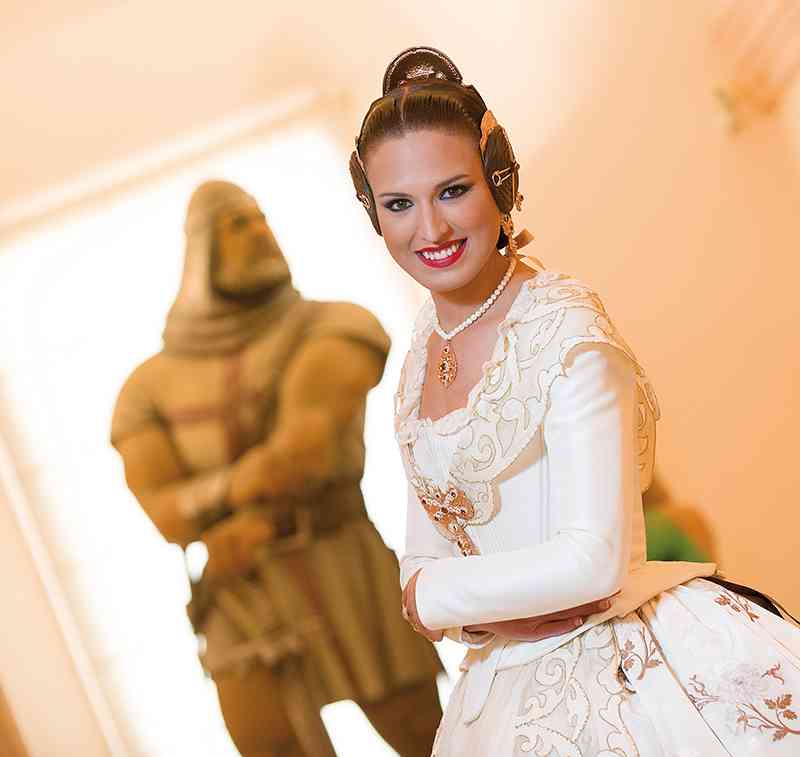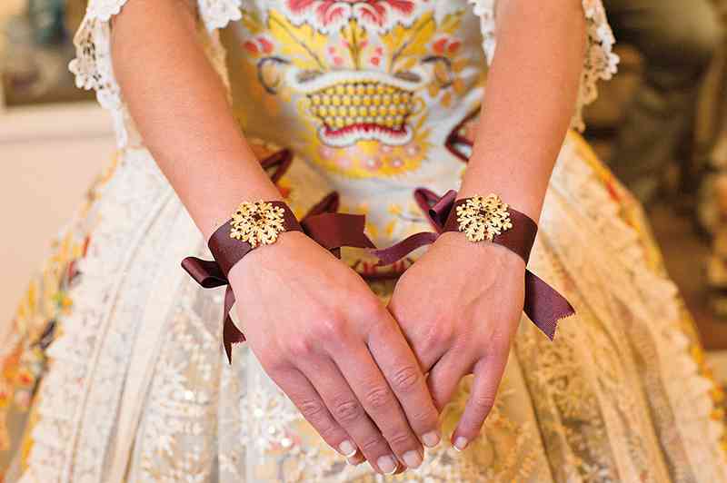 Roser y Consuelo también confeccionaron este traje, de estilo Siglo XVIII. Seda estrecha con el dibujo San Felipe en azul marino con metal plata. Manteletas de Artesanía Viana en seda y lentejuela plata. Aderezo de Art Antic en plata de ley con perlas naturales y cristales Swarosky en tono gris. Peinetas de Flor d’Aigua en plata envejecida con dibujo exclusivo.