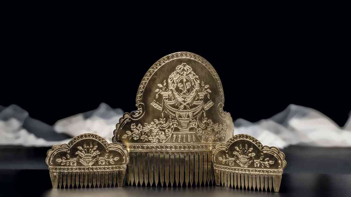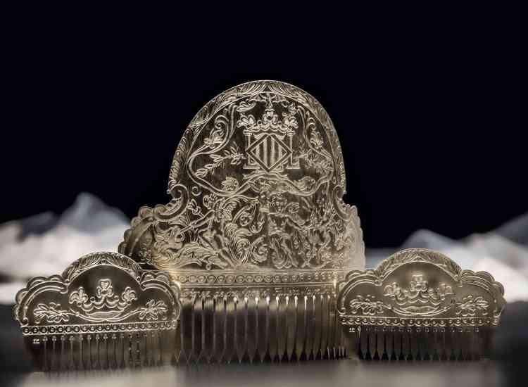 Las peinetas de la Corte para el segundo traje, del S. XVIII, presentan líneas rectas y 9 cm de altura. Están inspiradas en motivos y ornamentos vegetales tan característicos de los bordados, tejidos y sedas barrocas. El canto se ha diseñado en rocalla. El motivo central es un ramillete de pequeñas flores y con un eje de simetría central. Están trabajadas mediante la técnica decorativa de cincelado y repujado sobre superficie elástica que permite conseguir los volúmenes y el modelado deseados. Se han realizado en latón con acabado en oro ocreado. Las laterales siguen la línea tradicional de las tres curvas en rocalla.
