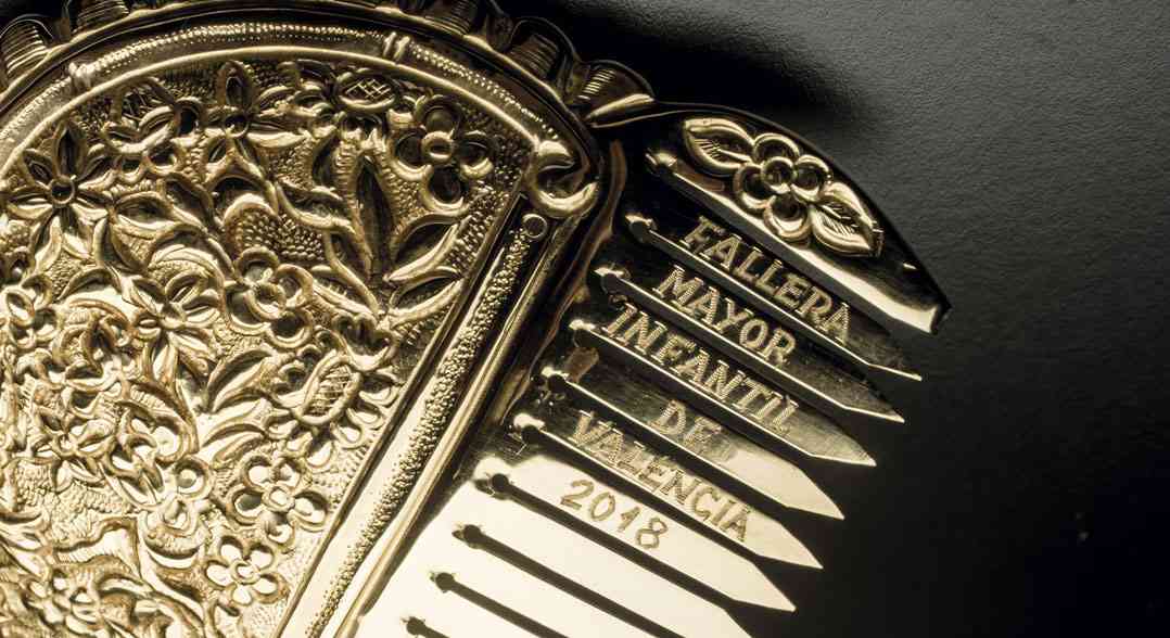 Para el primer traje de Daniela se sigue con el nuevo diseño de peineta. En este caso particular se cumplió con la premisa de incluir el emblema de la ciudad de Valencia. Como motivo arquitectónico remite al estilo neoclásico a semejanza de las peinetas de la Corte. Respecto a la temática de la parte inferior, Elisa afirma que se han querido incluir “las imágenes del Ángel Custodio defendiéndonos contra los males y los demonios”. Esta figura ha sido venerada en la ciudad desde la edad media y se podía ver en ‘les portes grans’ (Torres de Quart, Serranos, Mar y Sant Vicent), para protección de todo el pueblo. “Nos parecía una buena simbiosis para asociarla al emblema y que a la vez resultase más poético”. La peineta es exclusiva y está cincelada a ‘flor de agua’, acabada en oro con superficies matizada, así como personalizada con el nombre de Daniela y su cargo de representación.
