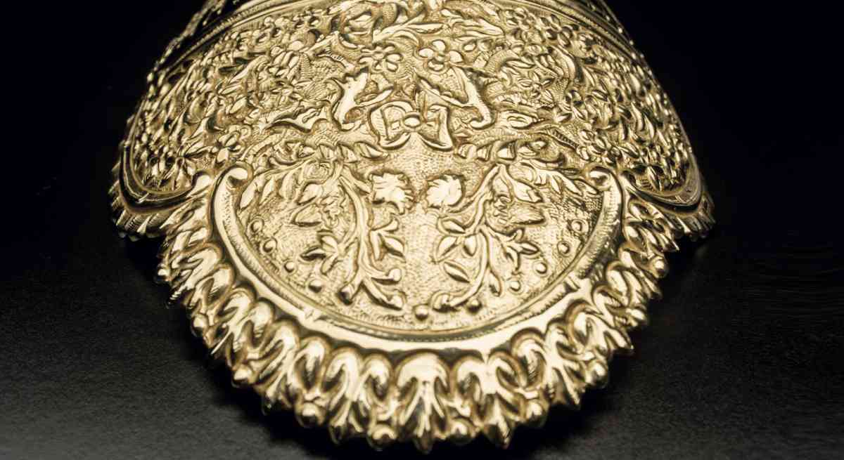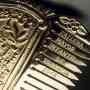 Las peinetas de Daniela para su segundo traje son de diseño exclusivo, siguiendo también el patrón clásico de púas o peine recto. El canto es en rocalla, muy repujado, a semejanza de un encaje de Bruselas. En el centro se ha querido reflejar un conjunto que remite a un frondoso jardín de ensueño con abundancia de ornamentación floral, y pajaritos que portan una lazada. La intención es la de transmitir la alegría infantil en las tardes de juego. Respecto a la técnica de trabajo es cincelado y repujado sobre superficies elásticas. Al igual que en el caso de la Corte, el acabado es en oro ocreado. “Para Daniela hemos personalizado la peineta con su nombre completo, año y cargo de representación, en este caso en las púas del peine”, matiza.