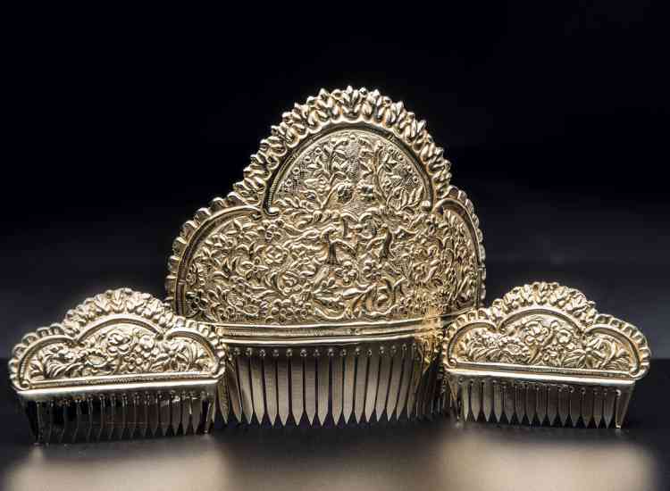 Las peinetas de la Corte para el segundo traje, del S. XVIII, presentan líneas rectas y 9 cm de altura. Están inspiradas en motivos y ornamentos vegetales tan característicos de los bordados, tejidos y sedas barrocas. El canto se ha diseñado en rocalla. El motivo central es un ramillete de pequeñas flores y con un eje de simetría central. Están trabajadas mediante la técnica decorativa de cincelado y repujado sobre superficie elástica que permite conseguir los volúmenes y el modelado deseados. Se han realizado en latón con acabado en oro ocreado. Las laterales siguen la línea tradicional de las tres curvas en rocalla.