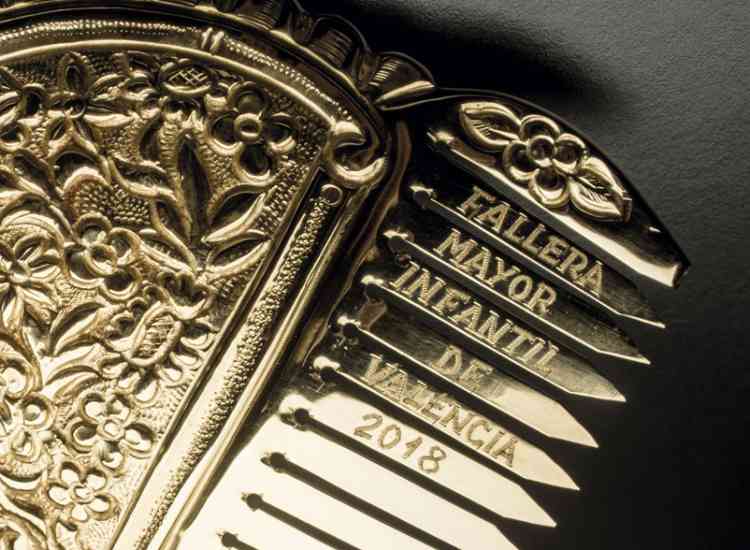 Para el primer traje de Daniela se sigue con el nuevo diseño de peineta. En este caso particular se cumplió con la premisa de incluir el emblema de la ciudad de Valencia. Como motivo arquitectónico remite al estilo neoclásico a semejanza de las peinetas de la Corte. Respecto a la temática de la parte inferior, Elisa afirma que se han querido incluir “las imágenes del Ángel Custodio defendiéndonos contra los males y los demonios”. Esta figura ha sido venerada en la ciudad desde la edad media y se podía ver en ‘les portes grans’ (Torres de Quart, Serranos, Mar y Sant Vicent), para protección de todo el pueblo. “Nos parecía una buena simbiosis para asociarla al emblema y que a la vez resultase más poético”. La peineta es exclusiva y está cincelada a ‘flor de agua’, acabada en oro con superficies matizada, así como personalizada con el nombre de Daniela y su cargo de representación.