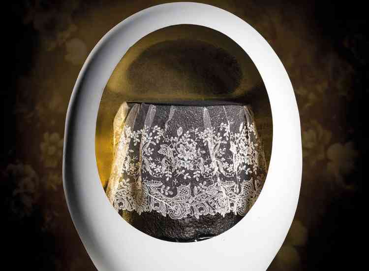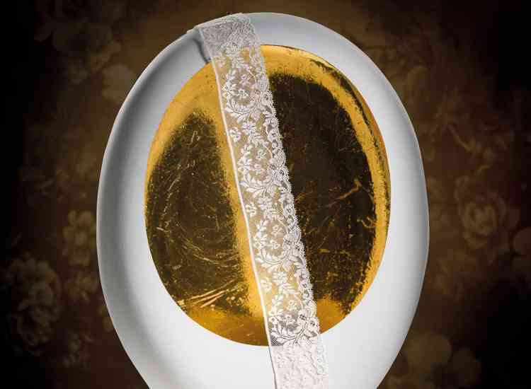 En el segundo traje, la Fallera Mayor Infantil luce un encaje de valennciene de 6 cm de ancho, color ivoire, con óvalos unidos entre sí formando lazadas.
