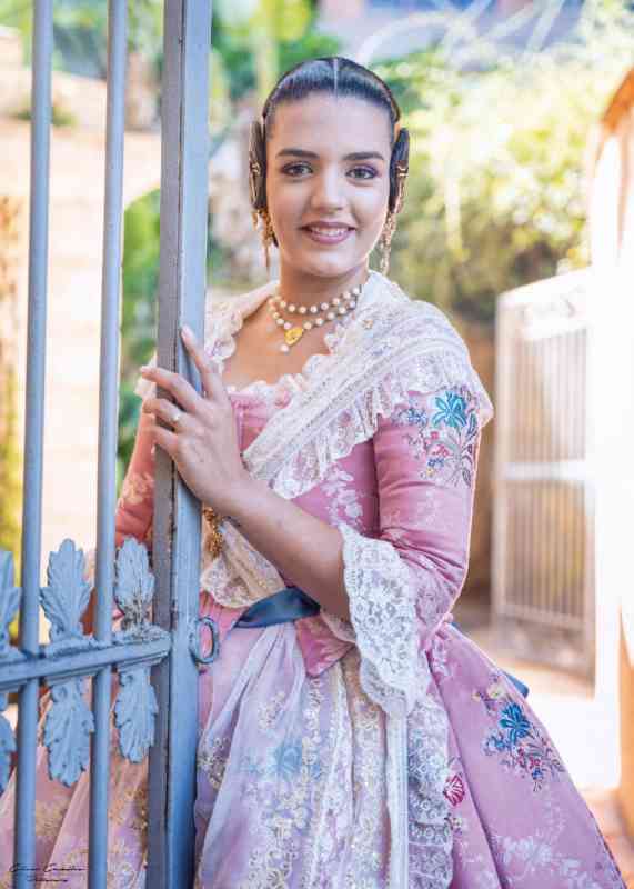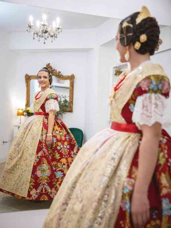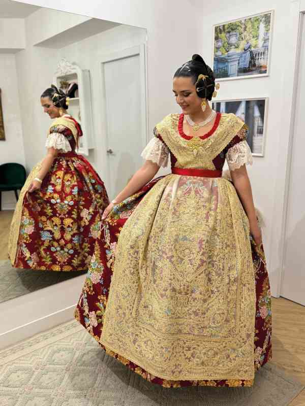 Teresa luce un lampas de seda Bocairent en Rojo Valentino, con unas manteletas en seda oscura y oro de Artesanía Viana, y peinetas del Taller Flor d’Aigua.